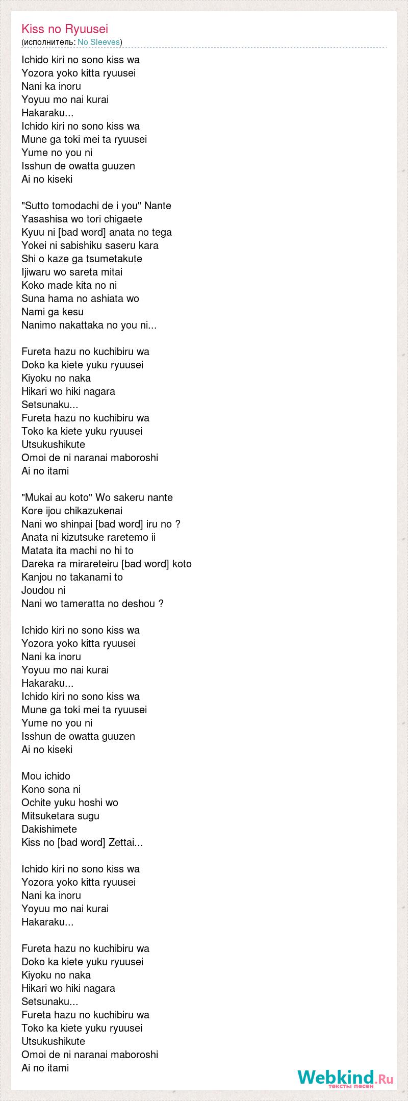 Ichido kiri no sono kiss wa Yozora yoko kitta ryuusei Nani ka inoru Yoyuu mo nai kurai Hakaraku... Ichido kiri no sono kiss wa Mune ga toki mei ta ryuusei Yume no you ni Isshun de owatta guuzen Ai no kiseki "Sutto tomodachi de i you" Nante Yasashisa wo tori chigaete Kyuu ni [bad word] anata no tega Yokei ni sabishiku saseru kara Shi o kaze ga tsumetakute Ijiwaru wo sareta mitai Koko made kita no ni Suna hama no ashiata wo Nami ga kesu Nanimo nakattaka no you ni... Fureta hazu no kuchibiru wa Doko ka kiete yuku ryuusei Kiyoku no naka Hikari wo hiki nagara Setsunaku... Fureta hazu no kuchibiru wa Toko ka kiete yuku ryuusei Utsukushikute Omoi de ni naranai maboroshi Ai no itami "Mukai au koto" Wo sakeru nante Kore ijou chikazukenai Nani wo shinpai [bad word] iru no ? Anata ni kizutsuke raretemo ii Matata ita machi no hi to Dareka ra mirareteiru [bad word] koto Kanjou no takanami to Joudou ni Nani wo tameratta no deshou ? Ichido kiri no sono kiss wa Yozora yoko kitta ryuusei Nani ka inoru Yoyuu mo nai kurai Hakaraku... Ichido kiri no sono kiss wa Mune ga toki mei ta ryuusei Yume no you ni Isshun de owatta guuzen Ai no kiseki Mou ichido Kono sona ni Ochite yuku hoshi wo Mitsuketara sugu Dakishimete Kiss no [bad word] Zettai... Ichido kiri no sono kiss wa Yozora yoko kitta ryuusei Nani ka inoru Yoyuu mo nai kurai Hakaraku... Fureta hazu no kuchibiru wa Doko ka kiete yuku ryuusei Kiyoku no naka Hikari wo hiki nagara Setsunaku... Fureta hazu no kuchibiru wa Toko ka kiete yuku ryuusei Utsukushikute Omoi de ni naranai maboroshi Ai no itami