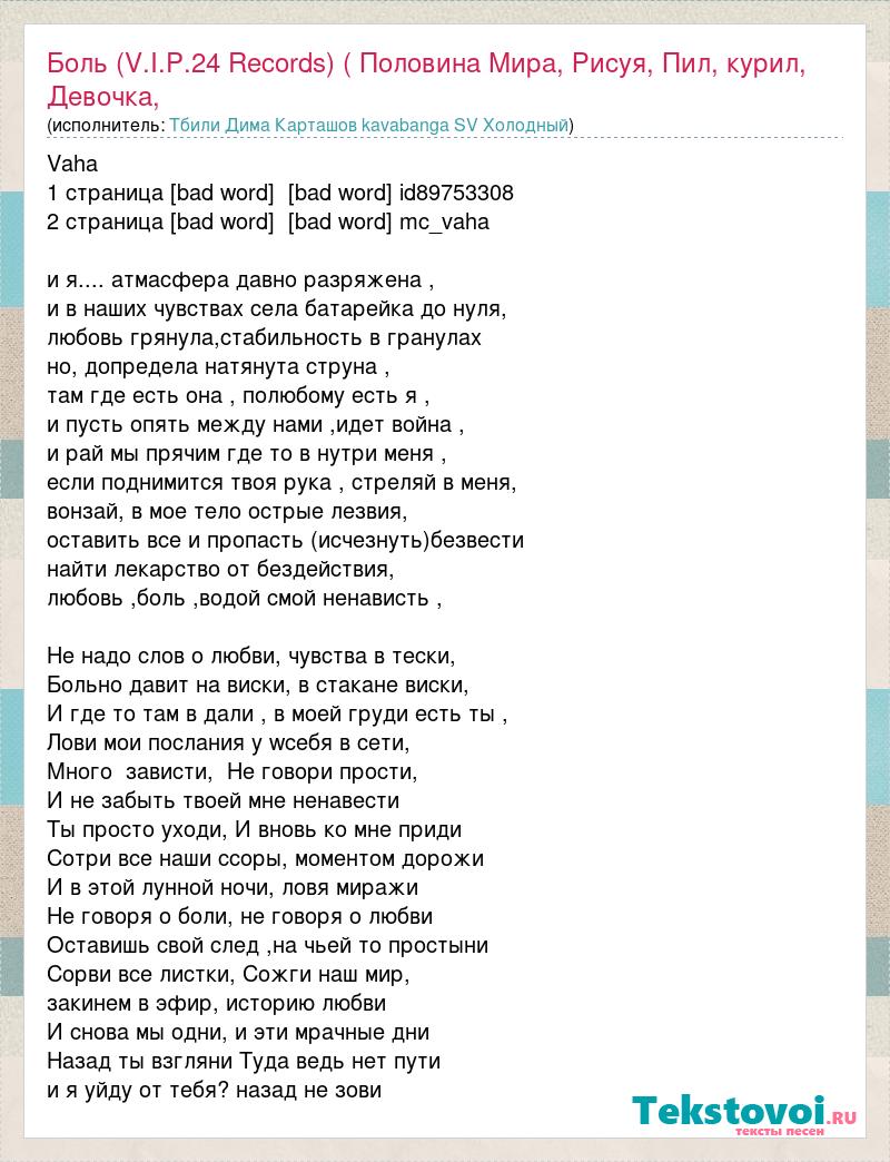 Vaha 1 страница [bad word] [bad word] id89753308 2 страница [bad word] [bad word] mc_vaha и я.... атмасфера давно разряжена , и в наших чувствах села батарейка до нуля, любовь грянула,стабильность в гранулах но, допредела натянута струна , там где есть она , полюбому есть я , и пусть опять между нами ,идет война , и рай мы прячим где то в нутри меня , если поднимится твоя рука , стреляй в меня, вонзай, в мое тело острые лезвия, оставить все и пропасть (исчезнуть)безвести найти лекарство от бездействия, любовь ,боль ,водой смой ненависть , Не надо слов о любви, чувства в тески, Больно давит на виски, в стакане виски, И где то там в дали , в моей груди есть ты , Лови мои послания у wсебя в сети, Много зависти, Не говори прости, И не забыть твоей мне ненавести Ты просто уходи, И вновь ко мне приди Сотри все наши ссоры, моментом дорожи И в этой лунной ночи, ловя миражи Не говоря о боли, не говоря о любви Оставишь свой след ,на чьей то простыни Сорви все листки, Сожги наш мир, закинем в эфир, историю любви И снова мы одни, и эти мрачные дни Назад ты взгляни Туда ведь нет пути и я уйду от тебя? назад не зови