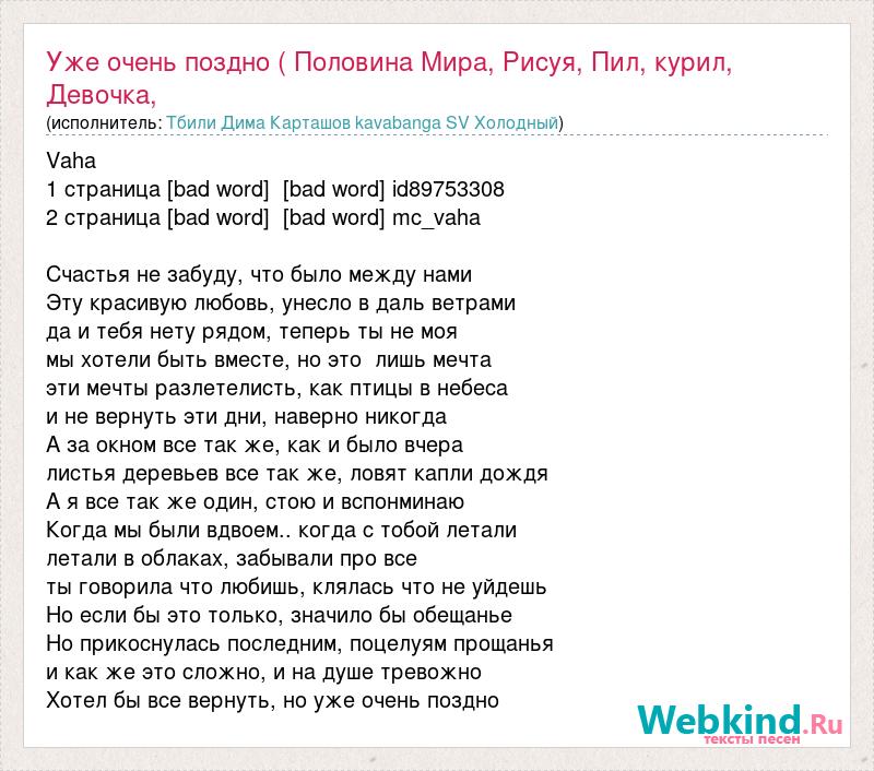 Vaha 1 страница [bad word] [bad word] id89753308 2 страница [bad word] [bad word] mc_vaha Счастья не забуду, что было между нами Эту красивую любовь, унесло в даль ветрами да и тебя нету рядом, теперь ты не моя мы хотели быть вместе, но это лишь мечта эти мечты разлетелисть, как птицы в небеса и не вернуть эти дни, наверно никогда А за окном все так же, как и было вчера листья деревьев все так же, ловят капли дождя А я все так же один, стою и вспонминаю Когда мы были вдвоем.. когда с тобой летали летали в облаках, забывали про все ты говорила что любишь, клялась что не уйдешь Но если бы это только, значило бы обещанье Но прикоснулась последним, поцелуям прощанья и как же это сложно, и на душе тревожно Хотел бы все вернуть, но уже очень поздно