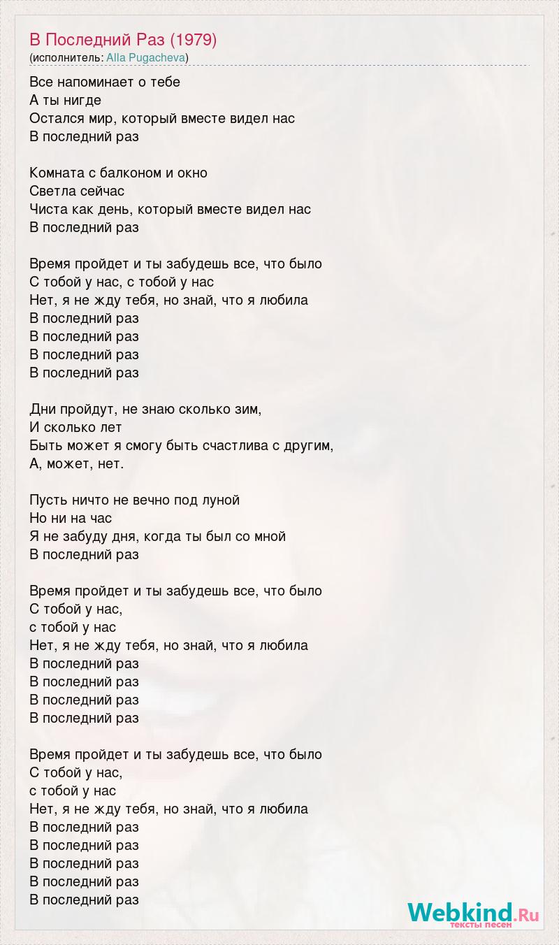 Все напоминает о тебе А ты нигде Остался мир, который вместе видел нас В последний раз Комната с балконом и окно Светла сейчас Чиста как день, который вместе видел нас В последний раз Время пройдет и ты забудешь все, что было С тобой у нас, с тобой у нас Нет, я не жду тебя, но знай, что я любила В последний раз В последний раз В последний раз В последний раз Дни пройдут, не знаю сколько зим, И сколько лет Быть может я смогу быть счастлива с другим, А, может, нет. Пусть ничто не вечно под луной Но ни на час Я не забуду дня, когда ты был со мной В последний раз Время пройдет и ты забудешь все, что было С тобой у нас, с тобой у нас Нет, я не жду тебя, но знай, что я любила В последний раз В последний раз В последний раз В последний раз Время пройдет и ты забудешь все, что было С тобой у нас, с тобой у нас Нет, я не жду тебя, но знай, что я любила В последний раз В последний раз В последний раз В последний раз В последний раз