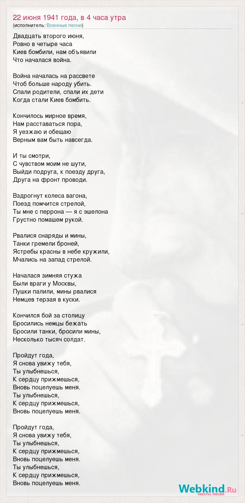 Двадцать второго июня, Ровно в четыре часа Киев бомбили, нам объявили Что началася война. Война началась на рассвете Чтоб больше народу убить. Спали родители, спали их дети Когда стали Киев бомбить. Кончилось мирное время, Нам расставаться пора, Я уезжаю и обещаю Верным вам быть навсегда. И ты смотри, С чувством моим не шути, Выйди подруга, к поезду друга, Друга на фронт проводи. Вздрогнут колеса вагона, Поезд помчится стрелой, Ты мне с перрона — я с эшелона Грустно помашем рукой. Рвалися снаряды и мины, Танки гремели броней, Ястребы красны в небе кружили, Мчались на запад стрелой. Началася зимняя стужа Были враги у Москвы, Пушки палили, мины рвалися Немцев терзая в куски. Кончился бой за столицу Бросились немцы бежать Бросили танки, бросили мины, Несколько тысяч солдат. Пройдут года, Я снова увижу тебя, Ты улыбнешься, К сердцу прижмешься, Вновь поцелуешь меня. Ты улыбнешься, К сердцу прижмешься, Вновь поцелуешь меня. Пройдут года, Я снова увижу тебя, Ты улыбнешься, К сердцу прижмешься, Вновь поцелуешь меня. Ты улыбнешься, К сердцу прижмешься, Вновь поцелуешь меня.