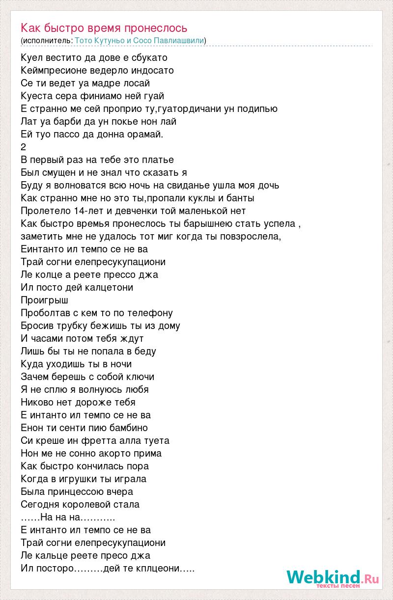 Куел вестито да дове е сбукато Кеймпресионе ведерло индосато Се ти ведет уа мадре лосай Куеста сера финиамо ней гуай Е странно ме сей проприо ту,гуатордичани ун подипью Лат уа барби да ун покье нон лай Ей туо пассо да донна орамай. 2 В первый раз на тебе это платье Был смущен и не знал что сказать я Буду я волноватся всю ночь на свиданье ушла моя дочь Как странно мне но это ты,пропали куклы и банты Пролетело 14-лет и девченки той маленькой нет Как быстро времья пронеслось ты барышнею стать успела , заметить мне не удалось тот миг когда ты повзрослела, Еинтанто ил темпо се не ва Трай согни елепресукупациони Ле колце а реете прессо джа Ил посто дей калцетони Проигрыш Проболтав с кем то по телефону Бросив трубку бежишь ты из дому И часами потом тебя ждут Лишь бы ты не попала в беду Куда уходишь ты в ночи Зачем берешь с собой ключи Я не сплю я волнуюсь любя Никово нет дороже тебя Е интанто ил темпо се не ва Енон ти сенти пию бамбино Си креше ин фретта алла туета Нон ме не сонно акорто прима Как быстро кончилась пора Когда в игрушки ты играла Была принцессою вчера Сегодня королевой стала ……На на на……….. Е интанто ил темпо се не ва Трай согни елепресукупациони Ле кальце реете пресо джа Ил посторо………дей те кплцеони…..