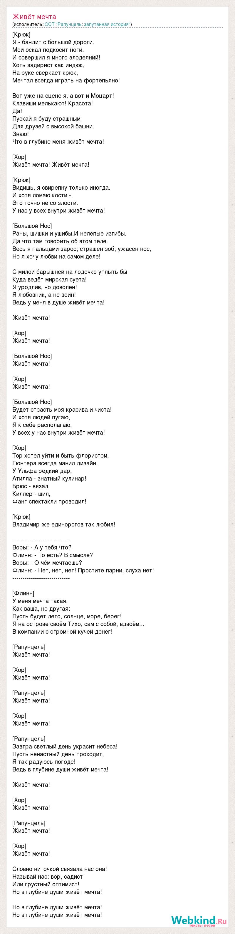 [Крюк] Я - бандит с большой дороги. Мой оскал подкосит ноги. И совершил я много злодеяний! Хоть задирист как индюк, На руке сверкает крюк, Мечтал всегда играть на фортепьяно! Вот уже на сцене я, а вот и Моцарт! Клавиши мелькают! Красота! Да! Пускай я буду страшным Для друзей с высокой башни. Знаю! Что в глубине меня живёт мечта! [Хор] Живёт мечта! Живёт мечта! [Крюк] Видишь, я свирепну только иногда. И хотя ломаю кости - Это точно не со злости. У нас у всех внутри живёт мечта! [Большой Нос] Раны, шишки и ушибы.И нелепые изгибы. Да что там говорить об этом теле. Весь я пальцами зарос; страшен зоб; ужасен нос, Но я хочу любви на самом деле! С милой барышней на лодочке уплыть бы Куда ведёт мирская суета! Я уродлив, но доволен! Я любовник, а не воин! Ведь у меня в душе живёт мечта! Живёт мечта! [Хор] Живёт мечта! [Большой Нос] Живёт мечта! [Хор] Живёт мечта! [Большой Нос] Будет страсть моя красива и чиста! И хотя людей пугаю, Я к себе располагаю. У всех у нас внутри живёт мечта! [Хор] Тор хотел уйти и быть флористом, Гюнтера всегда манил дизайн, У Ульфа редкий дар, Атилла - знатный кулинар! Брюс - вязал, Киллер - шил, Фанг спектакли проводил! [Крюк] Владимир же единорогов так любил! ---------------------------- Воры: - А у тебя что? Флинн: - То есть? В смысле? Воры: - О чём мечтаешь? Флинн: - Нет, нет, нет! Простите парни, слуха нет! ---------------------------- [Флинн] У меня мечта такая, Как ваша, но другая: Пусть будет лето, солнце, море, берег! Я на острове своём Тихо, сам с собой, вдвоём... В компании с огромной кучей денег! [Рапунцель] Живёт мечта! [Хор] Живёт мечта! [Рапунцель] Живёт мечта! [Хор] Живёт мечта! [Рапунцель] Завтра светлый день украсит небеса! Пусть ненастный день проходит, Я так радуюсь погоде! Ведь в глубине души живёт мечта! Живёт мечта! [Хор] Живёт мечта! [Рапунцель] Живёт мечта! [Хор] Живёт мечта! Словно ниточкой связала нас она! Называй нас: вор, садист Или грустный оптимист! Но в глубине души живёт мечта! Но в глубине души живёт мечта! Но в глубине души живёт мечта!