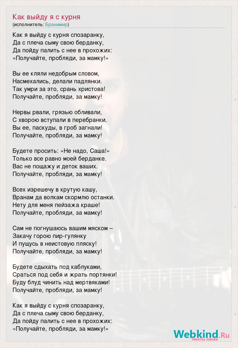 Как я выйду с курня спозаранку, Да с плеча сыму свою берданку, Да пойду палить с нее в прохожих: «Получайте, пробляди, за мамку!» Вы ее кляли недобрым словом, Насмехались, делали падлянки. Так умри за это, срань христова! Получайте, пробляди, за мамку! Нервы рвали, грязью обливали, С хворою вступали в перебранки. Вы ее, паскуды, в гроб загнали! Получайте, пробляди, за мамку! Будете просить: «Не надо, Саша!» Только все равно моей берданке. Вас не пощажу и деток ваших. Получайте, пробляди, за мамку! Всех изрешечу в крутую кашу, Вранам да волкам скормлю останки. Нету для меня пейзажа краше! Получайте, пробляди, за мамку! Сам не погнушаюсь вашим мяском – Закачу горою пир-гулянку И пущусь в неистовую пляску! Получайте, пробляди, за мамку! Будете сдыхать под каблуками, Сраться под себя и жрать портянки! Буду блуд чинить над мертвяками! Получайте, пробляди, за мамку! Как я выйду с курня спозаранку, Да с плеча сыму свою берданку, Да пойду палить с нее в прохожих: «Получайте, пробляди, за мамку!»