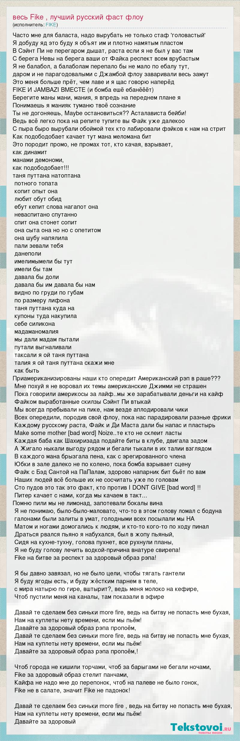 Часто мне для баласта, надо вырубать не только стаф 'головастый' Я добуду яд это буду я объят им и плотно намятым пластом В Сэйнт Пи не перегаром дышат, раста если я не был у вас там С берега Невы на берега ваши от Файка респект всем врубастым Я не балабол, а балаболам перепало бы не мало по ебалу тут, даром и не парагодовалыми с Джамбой флоу заваривали весь замут Это меня больше прёт, чем лаве и я щас говорю наперёд FIKE И JAMBAZI ВМЕСТЕ (и бомба ешё ебанёёёт) Берегите маны мани, мания, я впредь на переднем плане я Понимаешь я манияк туманю твоё сознание Ты не догоняешь, Maybe остановиться?? Асталависта бейби! Ведь всё легко пока на репите тупите вы Файк уже далекоо С пыра быро вырубали обоймой тех кто лабировали фэйков к нам на стрит Как подободобает качает тут мана меломана бит Это породит промо, не промах тот, кто качая, взрывает, как динамит манами демономи, как подободобает!!! таня путтана натоптана потного топата копит опыт она любит обут обид ебут кепит слова нагапот она неваспитано спутанно спит она стонет сопит она сыта она но но с опетитом она шубу напялила пали зевали тебя данеполи имелимымели бы тут имели бы там давала бы доли давала бы им давала бы нам видно по груди по губам по размеру лифона таня путтана куда на купоны туда накупила себе силикона мадаманомалия мы дали мадам пытали путали выгналивали таксали я ой таня путтана талия я ой таня путтана скажи мне как быть Приамериканизированы наши кто опередит Американский рэп в раше??? Мне похуй я не воровал их темы американские Джимми не страшен Пока говорили америкосы за лайф..мы же зарабатывали деньги на кайф Файком выработанные скилзы Сэйнт Пи втыкай Мы всегда пребывали на пике, нам везде аплодировали чики Всех опередили, породив свой флоу, пока нас парадировали разные фрики Каждому русскому раста, Файк и Ди Маста дали бы напас и пластырь Make some mother [bad word] Noize..те кто не склеит ласты Каждая баба как Шахиризада подайте биты в клубе, двигала задом А Жигало ныкали выгоду рядом и бегали тыкали в их талии взглядом В каждого мана брызгала пена, как с эрегированного члена Юбки в зале далеко не по колено, пока бомба взрывает сцену Файк с Бэд Сантой на ПаПалам, здорово напарник бит бьёт по вам Наших людей всё больше их не сосчитать уже по головам Сто пудов это так это факт, кто против I DONT GIVE [bad word] !! Питер качает с нами, когда мы качаем в такт... Помню пили мы не лимонад, запотевали бокалы вина Я не понимаю, было-было-маловато, что-то в этом голову ломал с бодуна галонами были залиты в умат, голодными всех посылали мы НА Матом и ногами домогались к людям, и кто-то кого-то по ходу пинал Драться рвался пьяно я набухался, был в жопу пьяный, Сидя на кухне-тухну, голова пухнет, все рухнули планы, Я не буду голову лечить водкой-причина внатуре свирепа! Fike на битве за респект за здоровый образ рэпа! Я бы давно завязал, но не было цели, чтобы тягать гантели Я буду ягоды есть, и буду жёстким парнем в теле, с мира натырю по гире, вштырит?, ведь меня молоко на кефире, Чтоб пустили меня на каналы, там показали в эфире Давай те сделаем без синьки more fire, ведь на битву не попасть мне бухая, Нам на куплеты нету времени, если мы пьём! Давайте за здоровый образ рэпа пропоём, Давай те сделаем без синьки more fire, ведь на битву не попасть мне бухая, Нам на куплеты нету времени, если мы пьём! Давайте за здоровый образ рэпа пропоём,! Чтоб города не к