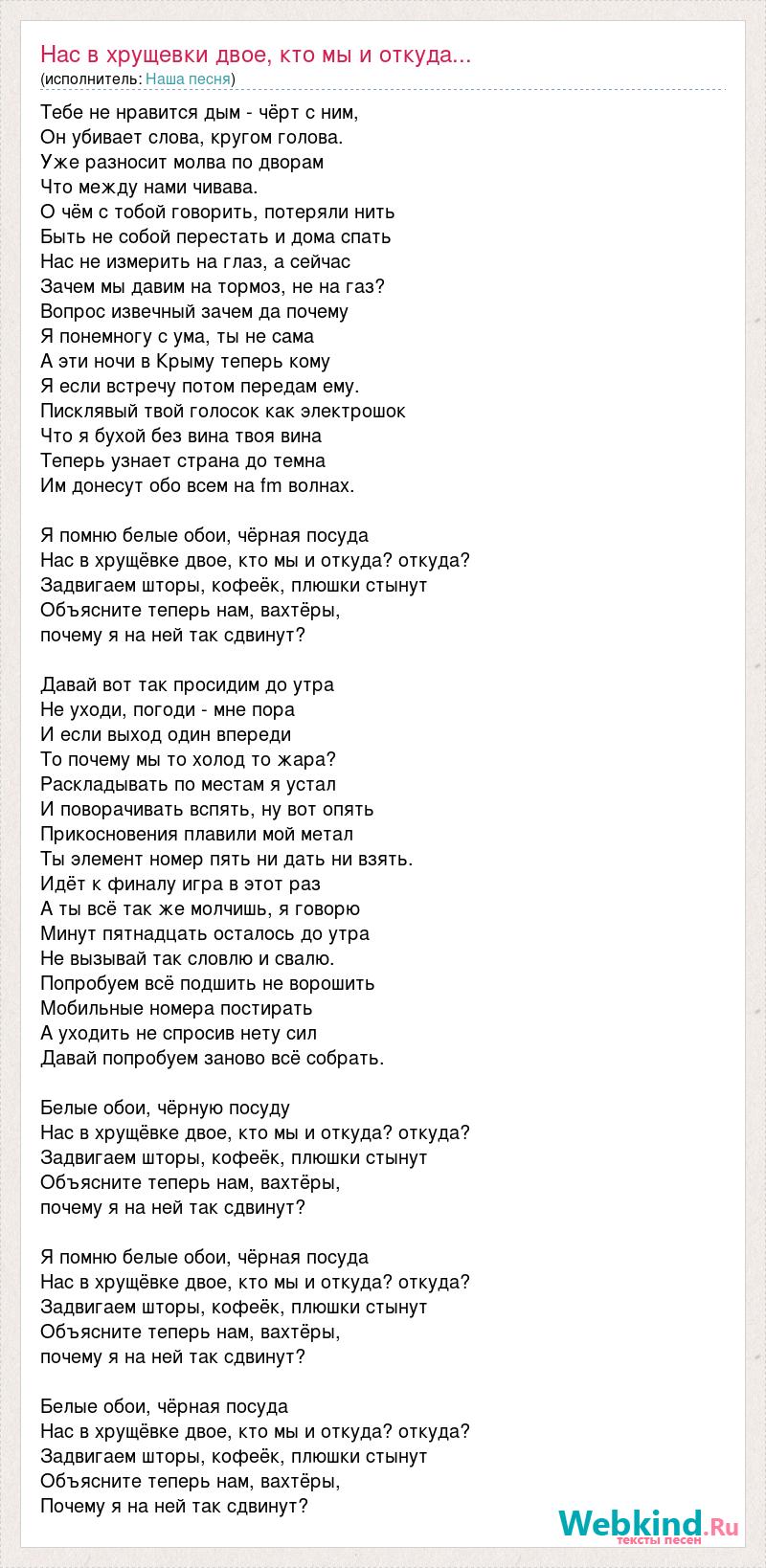 Тебе не нравится дым - чёрт с ним, Он убивает слова, кругом голова. Уже разносит молва по дворам Что между нами чивава. О чём с тобой говорить, потеряли нить Быть не собой перестать и дома спать Нас не измерить на глаз, а сейчас Зачем мы давим на тормоз, не на газ? Вопрос извечный зачем да почему Я понемногу с ума, ты не сама А эти ночи в Крыму теперь кому Я если встречу потом передам ему. Писклявый твой голосок как электрошок Что я бухой без вина твоя вина Теперь узнает страна до темна Им донесут обо всем на fm волнах. Я помню белые обои, чёрная посуда Нас в хрущёвке двое, кто мы и откуда? откуда? Задвигаем шторы, кофеёк, плюшки стынут Объясните теперь нам, вахтёры, почему я на ней так сдвинут? Давай вот так просидим до утра Не уходи, погоди - мне пора И если выход один впереди То почему мы то холод то жара? Раскладывать по местам я устал И поворачивать вспять, ну вот опять Прикосновения плавили мой метал Ты элемент номер пять ни дать ни взять. Идёт к финалу игра в этот раз А ты всё так же молчишь, я говорю Минут пятнадцать осталось до утра Не вызывай так словлю и свалю. Попробуем всё подшить не ворошить Мобильные номера постирать А уходить не спросив нету сил Давай попробуем заново всё собрать. Белые обои, чёрную посуду Нас в хрущёвке двое, кто мы и откуда? откуда? Задвигаем шторы, кофеёк, плюшки стынут Объясните теперь нам, вахтёры, почему я на ней так сдвинут? Я помню белые обои, чёрная посуда Нас в хрущёвке двое, кто мы и откуда? откуда? Задвигаем шторы, кофеёк, плюшки стынут Объясните теперь нам, вахтёры, почему я на ней так сдвинут? Белые обои, чёрная посуда Нас в хрущёвке двое, кто мы и откуда? откуда? Задвигаем шторы, кофеёк, плюшки стынут Объясните теперь нам, вахтёры, Почему я на ней так сдвинут?