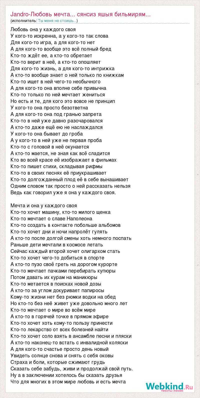 Любовь она у каждого своя У кого-то искренна, а у кого-то так слова Для кого-то игра, а для кого-то нет А для кого-то вообще это всё полный бред Кто-то ждёт ее, а кто-то обретает Кто-то верит в неё, а кто-то опошляет Для кого-то жизнь, а для кого-то интрижка А кто-то вообще знает о ней только по книжкам Кто-то ищет в ней чего-то необычного А для кого-то она вполне себе привычна Кто-то только по ней мечтает жениться Но есть и те, для кого это вовсе не принцип У кого-то она просто безответна А для кого-то она под гранью запрета Кто-то в ней уже давно разочаровался А кто-то даже ещё ею не наслаждался У кого-то она бывает до гроба А у кого-то в ней уже не первая проба Кто-то с головой в неё окунается А кто-то мается, не зная как всё сладится Кто во всей красе её изображает в фильмах Кто-то пишет стихи, складывая рифмы Кто-то в своих песнях её приукрашивает Кто-то долгожданный плод её в себе вынашивает Одним словом так просто о ней рассказать нельзя Ведь как говорил уже я она у каждого своя. Мечта и она у каждого своя Кто-то хочет машину, кто-то милого щенка Кто-то мечтает о славе Наполеона Кто-то создать в контакте побольше альбомов Кто-то хочет дни и ночи напролёт гулять А кто-то после долгой смены хоть немного поспать Раньше дети мечтали в космосе летать Сейчас каждый второй хочет олигархом стать Кто-то хочет чего-то добиться в спорте А кто-то пузо своё греть на дорогом курорте Кто-то мечтает пачками перебирать купюры Потом давать их курам на маникюры Кто-то метается в поисках новой дозы А кто-то за углом докуривает папиросы Кому-то жизни нет без рюмки водки на обед Но кто-то без неё живет уже довольно много лет Кто-то мечтает о мире во всём мире А кто-то в горячей точке в прямом эфире Кто-то хочет хоть кому-то пользу принести Кто-то лекарство от всех болезней найти Кто-то хочет соло взять в ансамбле песни и пляски А кто-то наконец-то встать с инвалидной коляски А для кого-то счастье просто день новый Увидеть солнце снова и снять с себя оковы Страха и боли, которые сжимают грудь Сказать себе забудь, живи и продолжай свой путь. Ну а в заключении хотелось бы сказать друзья Что для многих в этом мире любовь и есть мечта