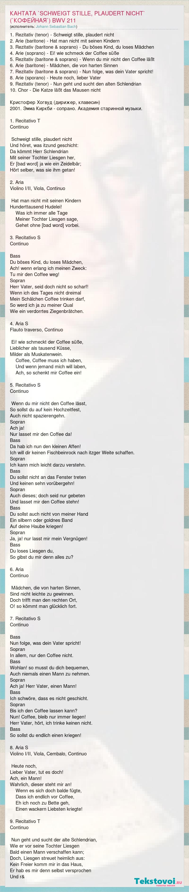 А как ты думаешь, о чем песня "КАНТАТА `SCHWEIGT STILLE, PLAUDERT NICHT` (`КОФЕЙНАЯ`) BWV 211" ?