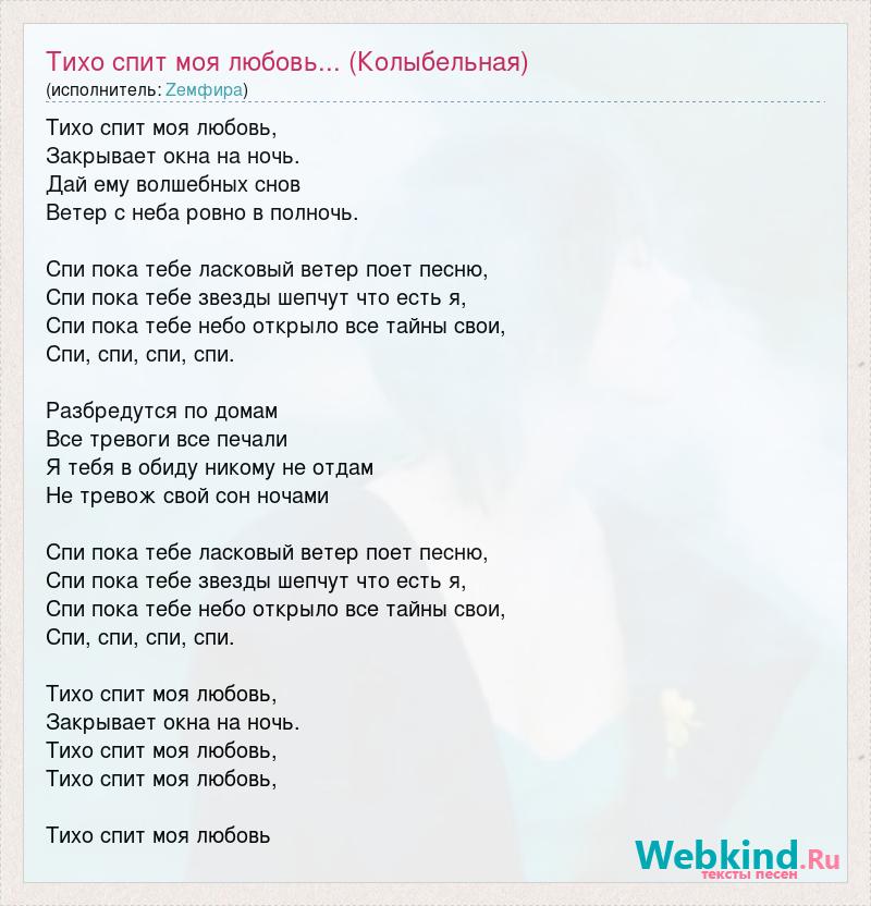 Тихо спит моя любовь, Закрывает окна на ночь. Дай ему волшебных снов Ветер с неба ровно в полночь. Спи пока тебе ласковый ветер поет песню, Спи пока тебе звезды шепчут что есть я, Спи пока тебе небо открыло все тайны свои, Спи, спи, спи, спи. Разбредутся по домам Все тревоги все печали Я тебя в обиду никому не отдам Не тревож свой сон ночами Спи пока тебе ласковый ветер поет песню, Спи пока тебе звезды шепчут что есть я, Спи пока тебе небо открыло все тайны свои, Спи, спи, спи, спи. Тихо спит моя любовь, Закрывает окна на ночь. Тихо спит моя любовь, Тихо спит моя любовь, Тихо спит моя любовь