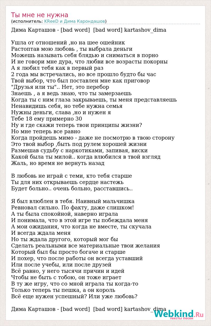 Дима Карташов - [bad word] [bad word] kartashov_dima Ушла от отношений ,но на шее ошейник Растоптав мою любовь , ты выбрала деньги Можешь называть себя блядью и сниматься в порно И не говори мне дура, что любви все возрасты покорны А я любил тебя как в первый раз 2 года мы встречались, но все прошло будто бы час Твой выбор, что был поставлен мне как приговор "Друзья или ты".. Нет, это перебор Знаешь , а я ведь знаю, что ты замерзаешь Когда ты с ним глаза закрываешь, ты меня представляешь Ненавидишь себя, но тебе нужна семья Нужны деньги, слава ,но и нужен я Тебе 18 ему примерно 30 Ну и где скажи теперь твои принципы жизни? Но мне теперь все равно Когда пройдешь мимо - даже не посмотрю в твою сторону Это твой выбор ,быть под рулем хорошей жизни Размешав судьбу с наркотиками, запивая, виски Какой была ты милой.. когда влюбился в твой взгляд Жаль, но время не вернуть назад В любовь не играй с теми, кто тебя старше Ты для них открываешь сердце настежь Будет больно.. очень больно, расставшись.. Я был влюблен в тебя. Наивный мальчишка Ревновал сильно. По факту, даже слишком! А ты была спокойной, наверно играла И понимала, что в этой игре ты побеждала меня А мои ожидания, что когда не вместе, ты скучала И всегда ждала меня Но ты ждала другого, который мог бы Сделать реальными все материальные твои желания Который был бы просто богаче и старше И похер, что после работы он всегда уставший Или после учебы, или после друзей Всё равно, у него тысячи причин и идей Чтобы не быть с тобою, он тоже играет В ту же игру, что со мной играла ты когда-то Только теперь ты пешка, а он король Всё еще нужен успешный? Или уже любовь? Дима Карташов - [bad word] [bad word] kartashov_dima