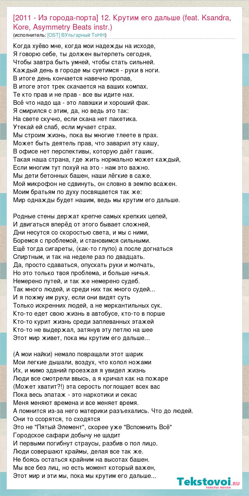 Когда хуёво мне, когда мои надежды на исходе, Я говорю себе, ты должен вытерпеть сегодня, Чтобы завтра быть умней, чтобы стать сильней. Каждый день в городе мы суетимся - руки в ноги. В итоге день кончается навечно пропав, В итоге этот трек скачается на ваших компах. Те кто прав и не прав - все вы идите нах. Всё что надо ща - это лавэшки и хороший фак. Я смирился с этим, да, но ведь это так: На свете скучно, если скана нет пакетика. Утекай ей слаб, если мучает страх. Мы строим жизнь, пока вы многие тлеете в прах. Может быть деятель прав, что заварил эту кашу, В офисе нет перспективы, которую даёт гашик. Такая наша страна, где жить нормально может каждый, Если многим тут похуй на это - нам это важно. Мы дети бетонных башен, наши лёгкие в саже. Мой микрофон не сдвинуть, он словно в землю всажен. Моим братьям по духу посвящается так же: Мир однажды будет нашим, ведь мы крутим его дальше. Родные стены держат крепче самых крепких цепей, И двигаться вперёд от этого бывает сложней, Дни несутся со скоростью света, и мы с ними, Боремся с проблемой, и становимся сильными. Ещё тогда сигареты, (как-то глупо) а после догнаться Спиртным, и так на неделе раз по двадцать. Да, просто сдаваться, опускать руки и молчать, Но это только твоя проблема, и больше ничья. Немерено путей, и так же немерено судеб. Так много людей, и среди них так много судей... И я пожму им руку, если они видят суть Только искренних людей, а не меркантильных сук. Кто-то едет свою жизнь в автобусе, кто-то в порше Кто-то курит жизнь среди заплеванных этажей Кто-то не выдержал, затянув эту петлю на шее Этот мир живет, пока мы крутим его дальше... (А мои найки) немало повращали этот шарик Мои легкие дышали, воздух, что колол ножами Их, и мимо зданий проезжая я увидел жизнь Люди все смотрели ввысь, а я кричал как на пожаре (Может хватит?!) эта серость поглощает всех вас Пока весь эпатаж - это наркотики и секас Меня меняют времена и все меняет время. А помнится из-за него материки разъехались. Что до людей. Они то ссорятся, то сходятся Это не "Пятый Элемент", скорее уже "Вспомнить Всё" Городское сафари добычу не щадит И первыми погибнут страусы, разбив о пол лицо. Люди совершают краймы, делая все так же. Не боясь остаться крайним на высотах башен. Мы все без лиц, но есть момент который важен, Этот мир и эти мы, пока мы крутим его дальше...