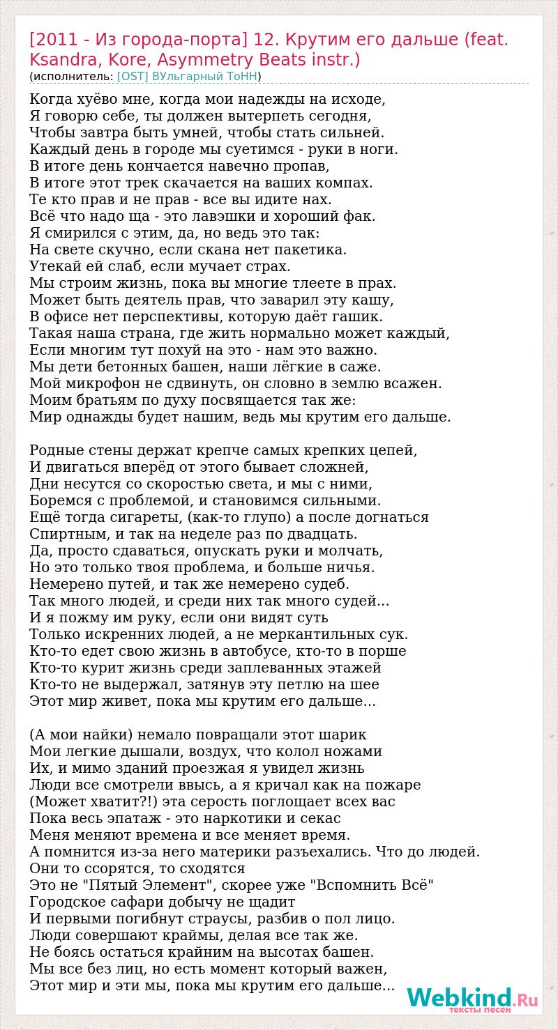 Когда хуёво мне, когда мои надежды на исходе, Я говорю себе, ты должен вытерпеть сегодня, Чтобы завтра быть умней, чтобы стать сильней. Каждый день в городе мы суетимся - руки в ноги. В итоге день кончается навечно пропав, В итоге этот трек скачается на ваших компах. Те кто прав и не прав - все вы идите нах. Всё что надо ща - это лавэшки и хороший фак. Я смирился с этим, да, но ведь это так: На свете скучно, если скана нет пакетика. Утекай ей слаб, если мучает страх. Мы строим жизнь, пока вы многие тлеете в прах. Может быть деятель прав, что заварил эту кашу, В офисе нет перспективы, которую даёт гашик. Такая наша страна, где жить нормально может каждый, Если многим тут похуй на это - нам это важно. Мы дети бетонных башен, наши лёгкие в саже. Мой микрофон не сдвинуть, он словно в землю всажен. Моим братьям по духу посвящается так же: Мир однажды будет нашим, ведь мы крутим его дальше. Родные стены держат крепче самых крепких цепей, И двигаться вперёд от этого бывает сложней, Дни несутся со скоростью света, и мы с ними, Боремся с проблемой, и становимся сильными. Ещё тогда сигареты, (как-то глупо) а после догнаться Спиртным, и так на неделе раз по двадцать. Да, просто сдаваться, опускать руки и молчать, Но это только твоя проблема, и больше ничья. Немерено путей, и так же немерено судеб. Так много людей, и среди них так много судей... И я пожму им руку, если они видят суть Только искренних людей, а не меркантильных сук. Кто-то едет свою жизнь в автобусе, кто-то в порше Кто-то курит жизнь среди заплеванных этажей Кто-то не выдержал, затянув эту петлю на шее Этот мир живет, пока мы крутим его дальше... (А мои найки) немало повращали этот шарик Мои легкие дышали, воздух, что колол ножами Их, и мимо зданий проезжая я увидел жизнь Люди все смотрели ввысь, а я кричал как на пожаре (Может хватит?!) эта серость поглощает всех вас Пока весь эпатаж - это наркотики и секас Меня меняют времена и все меняет время. А помнится из-за него материки разъехались. Что до людей. Они то ссорятся, то сходятся Это не "Пятый Элемент", скорее уже "Вспомнить Всё" Городское сафари добычу не щадит И первыми погибнут страусы, разбив о пол лицо. Люди совершают краймы, делая все так же. Не боясь остаться крайним на высотах башен. Мы все без лиц, но есть момент который важен, Этот мир и эти мы, пока мы крутим его дальше...