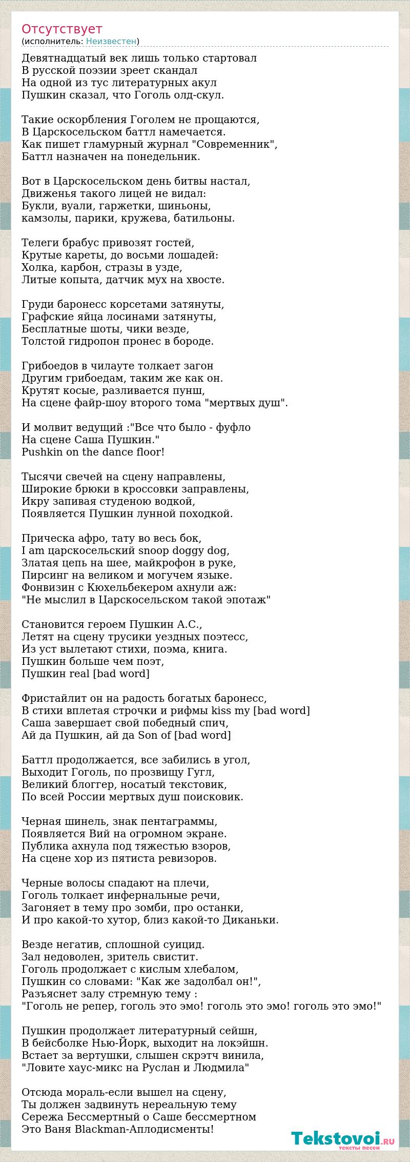 Девятнадцатый век лишь только стартовал В русской поэзии зреет скандал На одной из тус литературных акул Пушкин сказал, что Гоголь олд-скул. Такие оскорбления Гоголем не прощаются, В Царскосельском баттл намечается. Как пишет гламурный журнал "Современник", Баттл назначен на понедельник. Вот в Царскосельском день битвы настал, Движенья такого лицей не видал: Букли, вуали, гаржетки, шиньоны, камзолы, парики, кружева, батильоны. Телеги брабус привозят гостей, Крутые кареты, до восьми лошадей: Холка, карбон, стразы в узде, Литые копыта, датчик мух на хвосте. Груди баронесс корсетами затянуты, Графские яйца лосинами затянуты, Бесплатные шоты, чики везде, Толстой гидропон пронес в бороде. Грибоедов в чилауте толкает загон Другим грибоедам, таким же как он. Крутят косые, разливается пунш, На сцене файр-шоу второго тома "мертвых душ". И молвит ведущий :"Все что было - фуфло На сцене Саша Пушкин." Pushkin on the dance floor! Тысячи свечей на сцену направлены, Широкие брюки в кроссовки заправлены, Икру запивая студеною водкой, Появляется Пушкин лунной походкой. Прическа афро, тату во весь бок, I am царскосельский snoop doggy dog, Златая цепь на шее, майкрофон в руке, Пирсинг на великом и могучем языке. Фонвизин с Кюхельбекером ахнули аж: "Не мыслил в Царскосельском такой эпотаж" Становится героем Пушкин А.С., Летят на сцену трусики уездных поэтесс, Из уст вылетают стихи, поэма, книга. Пушкин больше чем поэт, Пушкин real nigga. Фристайлит он на радость богатых баронесс, В стихи вплетая строчки и рифмы kiss my ass, Саша завершает свой победный спич, Ай да Пушкин, ай да Son of Bitch. Баттл продолжается, все забились в угол, Выходит Гоголь, по прозвищу Гугл, Великий блоггер, носатый текстовик, По всей России мертвых душ поисковик. Черная шинель, знак пентаграммы, Появляется Вий на огромном экране. Публика ахнула под тяжестью взоров, На сцене хор из пятиста ревизоров. Черные волосы спадают на плечи, Гоголь толкает инфернальные речи, Загоняет в тему про зомби, про останки, И про какой-то хутор, близ какой-то Диканьки. Везде негатив, сплошной суицид. Зал недоволен, зритель свистит. Гоголь продолжает с кислым хлебалом, Пушкин со словами: "Как же задолбал он!", Разъяснет залу стремную тему : "Гоголь не репер, гоголь это эмо! гоголь это эмо! гоголь это эмо!" Пушкин продолжает литературный сейшн, В бейсболке Нью-Йорк, выходит на локэйшн. Встает за вертушки, слышен скрэтч винила, "Ловите хаус-микс на Руслан и Людмила" Отсюда мораль-если вышел на сцену, Ты должен задвинуть нереальную тему Сережа Бессмертный о Саше бессмертном Это Ваня Blackman-Аплодисменты!