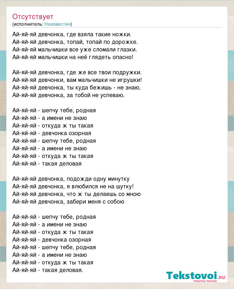 Ай-яй-яй девчонка, где взяла такие ножки. Ай-яй-яй девчонка, топай, топай по дорожке. Ай-яй-яй мальчишки все уже сломали глазки. Ай-яй-яй мальчишки на неё глядеть опасно! Ай-яй-яй девчонка, где же все твои подружки. Ай-яй-яй девчонки, вам мальчишки не игрушки! Ай-яй-яй девчонка, ты куда бежишь - не знаю. Ай-яй-яй девчонка, за тобой не успеваю. Ай-яй-яй - шепчу тебе, родная Ай-яй-яй - а имени не знаю Ай-яй-яй - откуда ж ты такая Ай-яй-яй - девчонка озорная Ай-яй-яй - шепчу тебе, родная Ай-яй-яй - а имени не знаю Ай-яй-яй - откуда ж ты такая Ай-яй-яй - такая деловая Ай-яй-яй девчонка, подожди одну минутку Ай-яй-яй девчонка, я влюбился не на шутку! Ай-яй-яй девчонка, что ж ты делаешь со мною Ай-яй-яй девчонка, забери меня с собою Ай-яй-яй - шепчу тебе, родная Ай-яй-яй - а имени не знаю Ай-яй-яй - откуда ж ты такая Ай-яй-яй - девчонка озорная Ай-яй-яй - шепчу тебе, родная Ай-яй-яй - а имени не знаю Ай-яй-яй - откуда ж ты такая Ай-яй-яй - такая деловая.