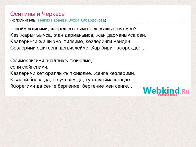 ...сюймеклигими, жюрек жырымы нек жашырама мен? Кез жарыгъымса, жан дарманымса, жан дарманымса сен. Кезлеринги жашырма, тилейме, кезлеринги менден. Сезлерими эшитсенг деп,излейме. Хар бири - жюрекден... Сюймеклигими ачаллыкъ тюйюлме, сени сюйгеними. Кезлерими кетюраллыкъ тюйюлме...сенге кезлерими. Къалай болса да, не уялсам да, туралмайма кенгде. Жюрегими да сенге бергенме, бергенме мен сенге...