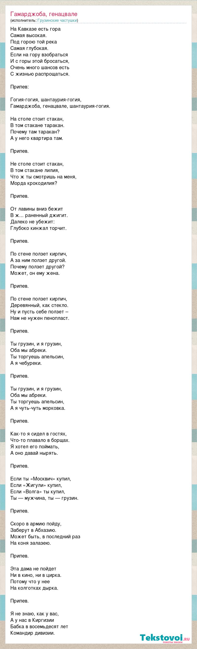 На Кавказе есть гора Самая высокая. Под горою той река Самая глубокая. Если на гору взобраться И с горы этой бросаться, Очень много шансов есть С жизнью распрощаться. Припев: Гогия-гогия, шантаурия-гогия, Гамарджоба, генацвале, шантаурия-гогия. На столе стоит стакан, В том стакане таракан. Почему там таракан? А у него квартира там. Припев. Не столе стоит стакан, В том стакане лилия, Что ж ты смотришь на меня, Морда крокодилия? Припев. От лавины вниз бежит В ж... раненный джигит. Далеко не убежит: Глубоко кинжал торчит. Припев. По стене ползет кирпич, А за ним ползет другой. Почему ползет другой? Может, он ему жена. Припев. По стене ползет кирпич, Деревянный, как стекло. Ну и пусть себе ползет – Нам не нужен пенопласт. Припев. Ты грузин, и я грузин, Оба мы абреки. Ты торгуешь апельсин, А я чебуреки. Припев. Ты грузин, и я грузин, Оба мы абреки. Ты торгуешь апельсин, А я чуть-чуть морковка. Припев. Как-то я сидел в гостях, Что-то плавало в борщах. Я хотел его поймать, А оно давай нырять. Припев. Если ты «Москвич» купил, Если «Жигули» купил, Если «Волга» ты купил, Ты — мужчина, ты — грузин. Припев. Скоро в армию пойду, Заберут в Абхазию. Может быть, в последний раз На коня залазею. Припев. Эта дама не пойдет Ни в кино, ни в цирка. Потому что у нее На колготках дырка. Припев. Я не знаю, как у вас, А у нас в Киргизии Бабка в восемьдесят лет Командир дивизии.
