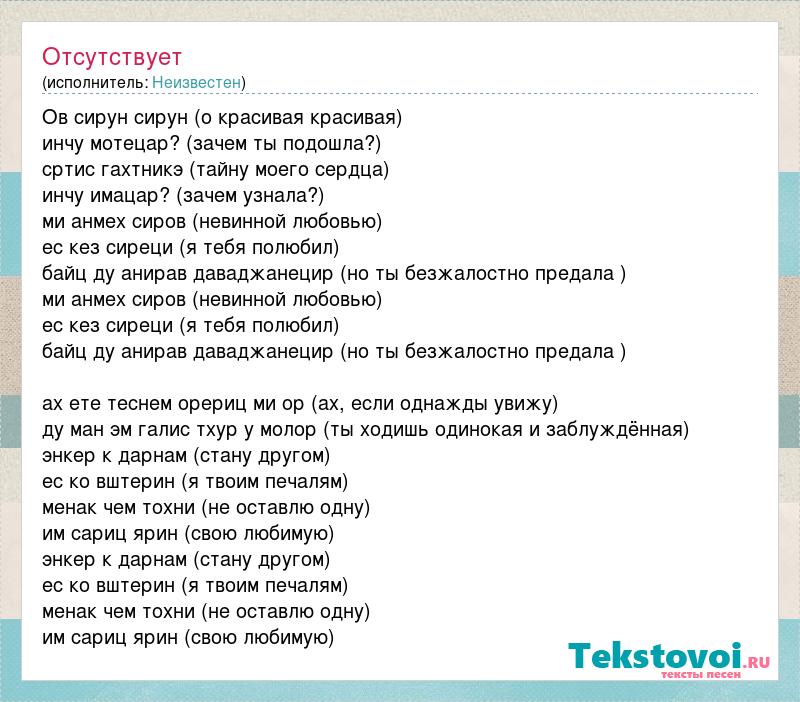Ов сирун сирун (о красивая красивая) инчу мотецар? (зачем ты подошла?) сртис гахтникэ (тайну моего сердца) инчу имацар? (зачем узнала?) ми анмех сиров (невинной любовью) ес кез сиреци (я тебя полюбил) байц ду анирав даваджанецир (но ты безжалостно предала ) ми анмех сиров (невинной любовью) ес кез сиреци (я тебя полюбил) байц ду анирав даваджанецир (но ты безжалостно предала ) ах ете теснем орериц ми ор (ах, если однажды увижу) ду ман эм галис тхур у молор (ты ходишь одинокая и заблуждённая) энкер к дарнам (стану другом) ес ко вштерин (я твоим печалям) менак чем тохни (не оставлю одну) им сариц ярин (свою любимую) энкер к дарнам (стану другом) ес ко вштерин (я твоим печалям) менак чем тохни (не оставлю одну) им сариц ярин (свою любимую)