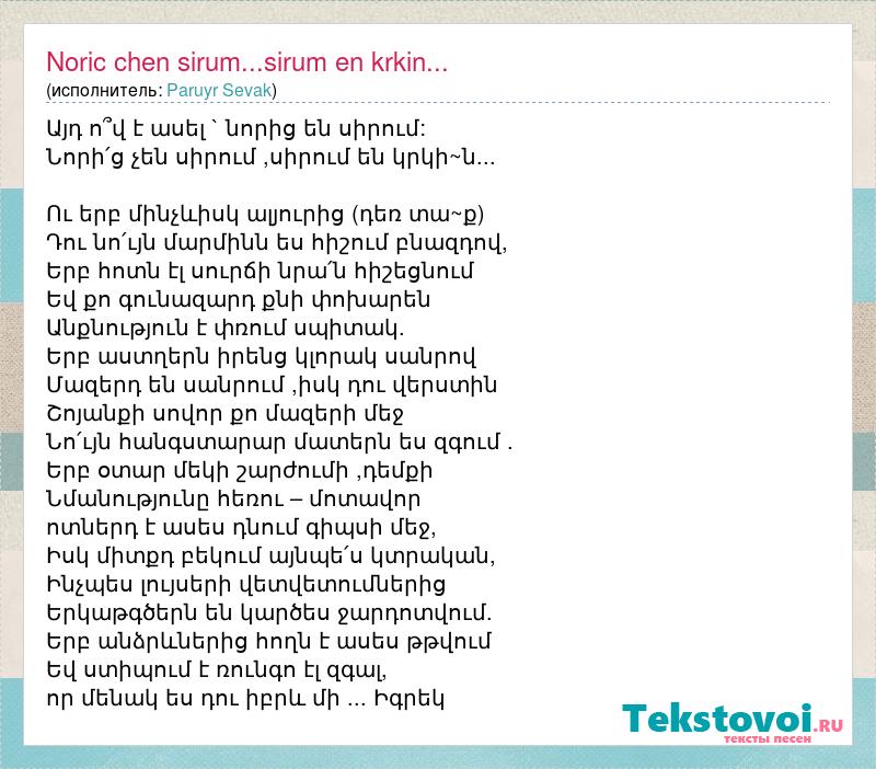 А как ты думаешь, о чем песня "Noric chen sirum...sirum en krkin..." ?
