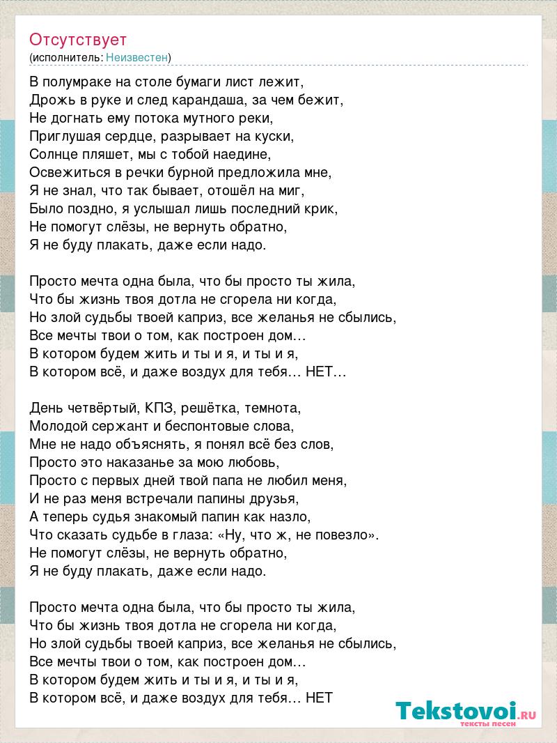 В полумраке на столе бумаги лист лежит, Дрожь в руке и след карандаша, за чем бежит, Не догнать ему потока мутного реки, Приглушая сердце, разрывает на куски, Солнце пляшет, мы с тобой наедине, Освежиться в речки бурной предложила мне, Я не знал, что так бывает, отошёл на миг, Было поздно, я услышал лишь последний крик, Не помогут слёзы, не вернуть обратно, Я не буду плакать, даже если надо. Просто мечта одна была, что бы просто ты жила, Что бы жизнь твоя дотла не сгорела ни когда, Но злой судьбы твоей каприз, все желанья не сбылись, Все мечты твои о том, как построен дом… В котором будем жить и ты и я, и ты и я, В котором всё, и даже воздух для тебя… НЕТ… День четвёртый, КПЗ, решётка, темнота, Молодой сержант и беспонтовые слова, Мне не надо объяснять, я понял всё без слов, Просто это наказанье за мою любовь, Просто с первых дней твой папа не любил меня, И не раз меня встречали папины друзья, А теперь судья знакомый папин как назло, Что сказать судьбе в глаза: «Ну, что ж, не повезло». Не помогут слёзы, не вернуть обратно, Я не буду плакать, даже если надо. Просто мечта одна была, что бы просто ты жила, Что бы жизнь твоя дотла не сгорела ни когда, Но злой судьбы твоей каприз, все желанья не сбылись, Все мечты твои о том, как построен дом… В котором будем жить и ты и я, и ты и я, В котором всё, и даже воздух для тебя… НЕТ