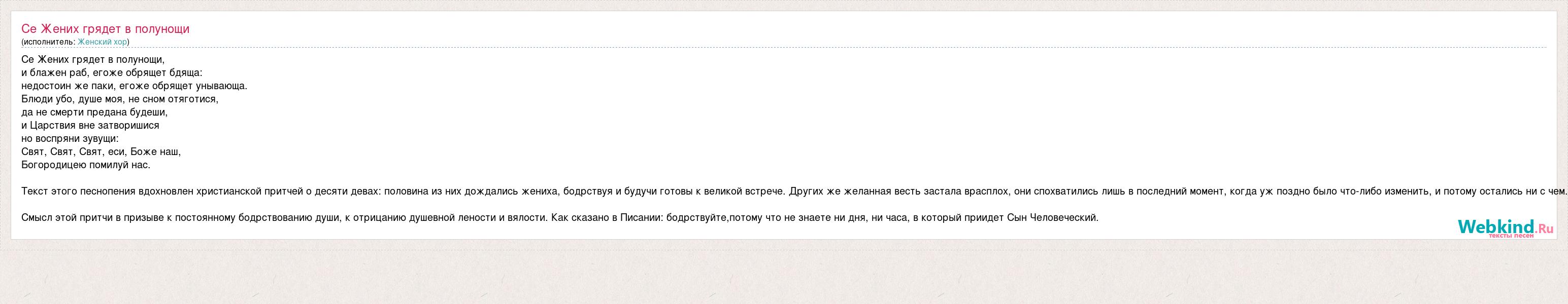Се Жених грядет в полунощи, и блажен раб, егоже обрящет бдяща: недостоин же паки, егоже обрящет унывающа. Блюди убо, душе моя, не сном отяготися, да не смерти предана будеши, и Царствия вне затворишися но воспряни зувущи: Свят, Свят, Свят, еси, Боже наш, Богородицею помилуй нас. Текст этого песнопения вдохновлен христианской притчей о десяти девах: половина из них дождались жениха, бодрствуя и будучи готовы к великой встрече. Других же желанная весть застала врасплох, они спохватились лишь в последний момент, когда уж поздно было что-либо изменить, и потому остались ни с чем. Смысл этой притчи в призыве к постоянному бодрствованию души, к отрицанию душевной лености и вялости. Как сказано в Писании: бодрствуйте,потому что не знаете ни дня, ни часа, в который приидет Сын Человеческий.