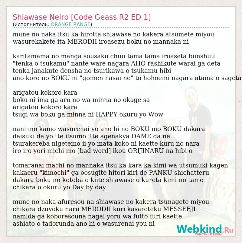 А как ты думаешь, о чем песня "Shiawase Neiro [Code Geass R2 ED 1]" ?