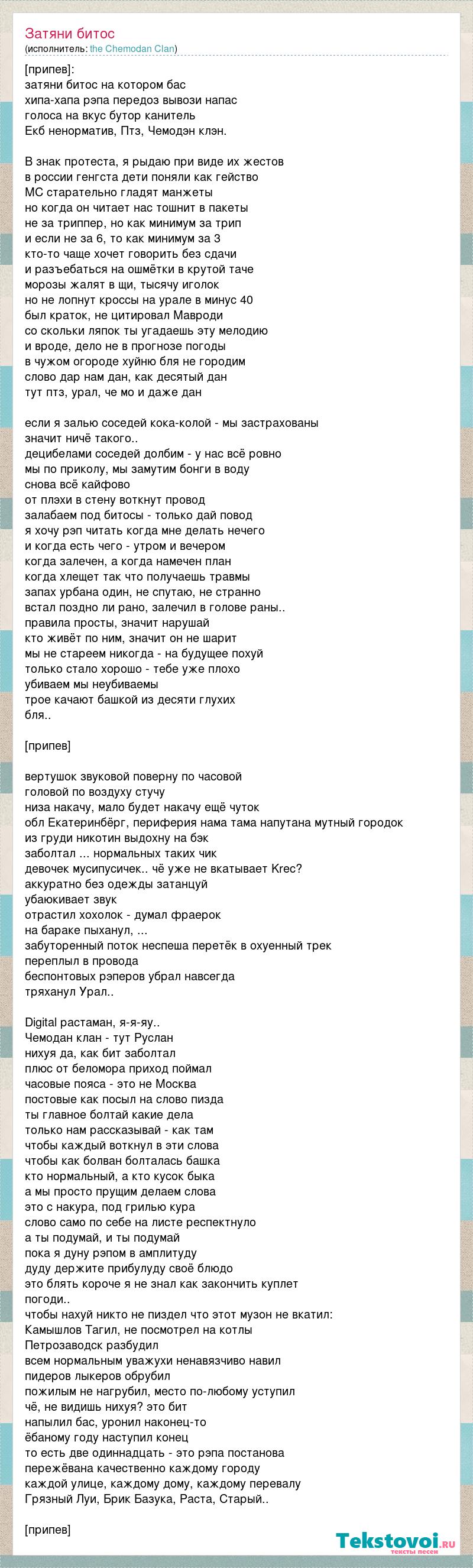 [припев]: затяни битос на котором бас хипа-хапа рэпа передоз вывози напас голоса на вкус бутор канитель Екб ненорматив, Птз, Чемодэн клэн. В знак протеста, я рыдаю при виде их жестов в россии генгста дети поняли как гейство МС старательно гладят манжеты но когда он читает нас тошнит в пакеты не за триппер, но как минимум за трип и если не за 6, то как минимум за 3 кто-то чаще хочет говорить без сдачи и разъебаться на ошмётки в крутой таче морозы жалят в щи, тысячу иголок но не лопнут кроссы на урале в минус 40 был краток, не цитировал Мавроди со скольки ляпок ты угадаешь эту мелодию и вроде, дело не в прогнозе погоды в чужом огороде хуйню бля не городим слово дар нам дан, как десятый дан тут птз, урал, че мо и даже дан если я залью соседей кока-колой - мы застрахованы значит ничё такого.. децибелами соседей долбим - у нас всё ровно мы по приколу, мы замутим бонги в воду снова всё кайфово от плэхи в стену воткнут провод залабаем под битосы - только дай повод я хочу рэп читать когда мне делать нечего и когда есть чего - утром и вечером когда залечен, а когда намечен план когда хлещет так что получаешь травмы запах урбана один, не спутаю, не странно встал поздно ли рано, залечил в голове раны.. правила просты, значит нарушай кто живёт по ним, значит он не шарит мы не стареем никогда - на будущее похуй только стало хорошо - тебе уже плохо убиваем мы неубиваемы трое качают башкой из десяти глухих бля.. [припев] вертушок звуковой поверну по часовой головой по воздуху стучу низа накачу, мало будет накачу ещё чуток обл Екатеринбёрг, периферия нама тама напутана мутный городок из груди никотин выдохну на бэк заболтал ... нормальных таких чик девочек мусипусичек.. чё уже не вкатывает Krec? аккуратно без одежды затанцуй убаюкивает звук отрастил хохолок - думал фраерок на бараке пыханул, ... забуторенный поток неспеша перетёк в охуенный трек переплыл в провода беспонтовых рэперов убрал навсегда тряханул Урал.. Digital растаман, я-я-яу.. Чемодан клан - тут Руслан нихуя да, как бит заболтал плюс от беломора приход поймал часовые пояса - это не Москва постовые как посыл на слово пизда ты главное болтай какие дела только нам рассказывай - как там чтобы каждый воткнул в эти слова чтобы как болван болталась башка кто нормальный, а кто кусок быка а мы просто прущим делаем слова это с накура, под грилью кура слово само по себе на листе респектнуло а ты подумай, и ты подумай пока я дуну рэпом в амплитуду дуду держите прибулуду своё блюдо это блять короче я не знал как закончить куплет погоди.. чтобы нахуй никто не пиздел что этот музон не вкатил: Камышлов Тагил, не посмотрел на котлы Петрозаводск разбудил всем нормальным уважухи ненавязчиво навил пидеров лыкеров обрубил пожилым не нагрубил, место по-любому уступил чё, не видишь нихуя? это бит напылил бас, уронил наконец-то ёбаному году наступил конец то есть две одиннадцать - это рэпа постанова пережёвана качественно каждому городу каждой улице, каждому дому, каждому перевалу Грязный Луи, Брик Базука, Раста, Старый.. [припев]