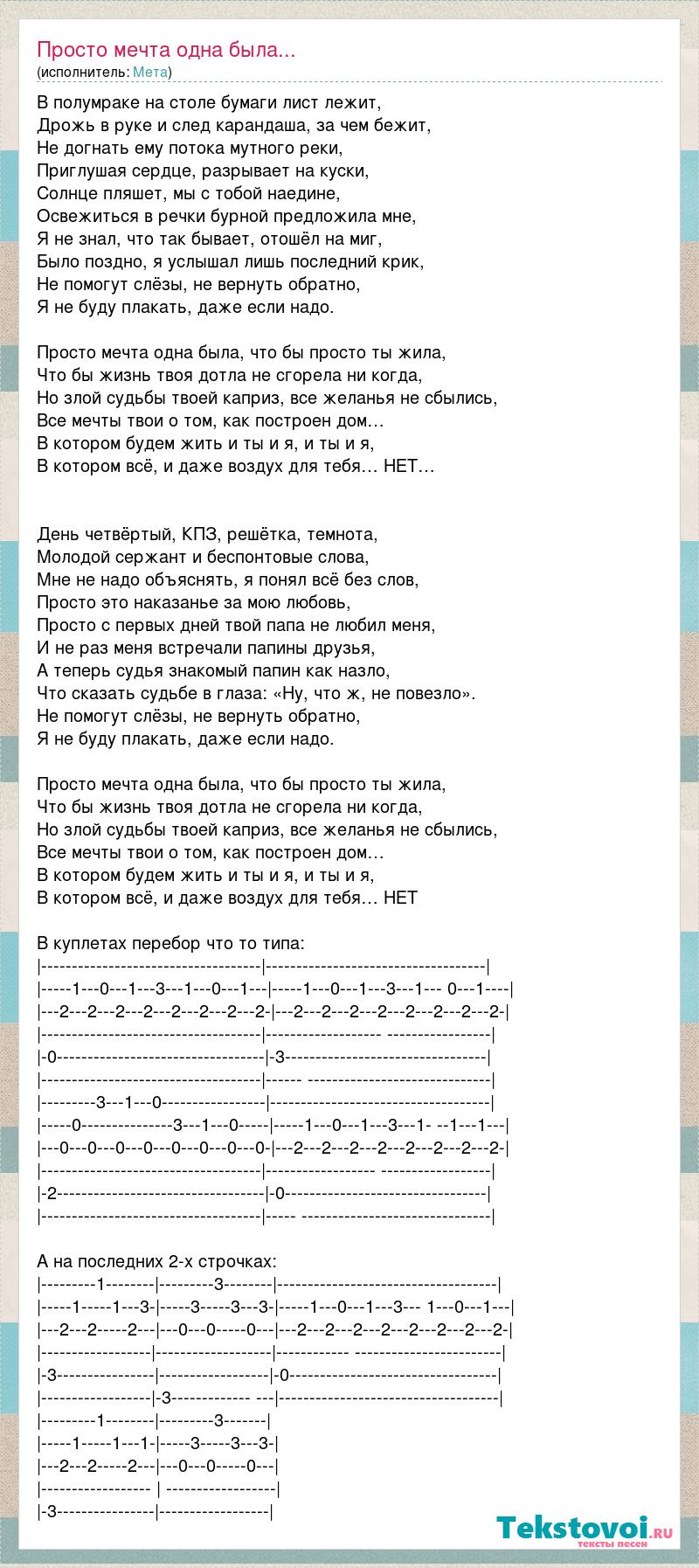 В полумраке на столе бумаги лист лежит, Дрожь в руке и след карандаша, за чем бежит, Не догнать ему потока мутного реки, Приглушая сердце, разрывает на куски, Солнце пляшет, мы с тобой наедине, Освежиться в речки бурной предложила мне, Я не знал, что так бывает, отошёл на миг, Было поздно, я услышал лишь последний крик, Не помогут слёзы, не вернуть обратно, Я не буду плакать, даже если надо. Просто мечта одна была, что бы просто ты жила, Что бы жизнь твоя дотла не сгорела ни когда, Но злой судьбы твоей каприз, все желанья не сбылись, Все мечты твои о том, как построен дом… В котором будем жить и ты и я, и ты и я, В котором всё, и даже воздух для тебя… НЕТ… День четвёртый, КПЗ, решётка, темнота, Молодой сержант и беспонтовые слова, Мне не надо объяснять, я понял всё без слов, Просто это наказанье за мою любовь, Просто с первых дней твой папа не любил меня, И не раз меня встречали папины друзья, А теперь судья знакомый папин как назло, Что сказать судьбе в глаза: «Ну, что ж, не повезло». Не помогут слёзы, не вернуть обратно, Я не буду плакать, даже если надо. Просто мечта одна была, что бы просто ты жила, Что бы жизнь твоя дотла не сгорела ни когда, Но злой судьбы твоей каприз, все желанья не сбылись, Все мечты твои о том, как построен дом… В котором будем жить и ты и я, и ты и я, В котором всё, и даже воздух для тебя… НЕТ В куплетах перебор что то типа: |------------------------------------|------------------------------------| |-----1---0---1---3---1---0---1---|-----1---0---1---3---1--- 0---1----| |---2---2---2---2---2---2---2---2-|---2---2---2---2---2---2---2---2-| |------------------------------------|------------------- -----------------| |-0----------------------------------|-3---------------------------------| |------------------------------------|------ ------------------------------| |---------3---1---0-----------------|------------------------------------| |-----0---------------3---1---0-----|-----1---0---1---3---1- --1---1---| |---0---0---0---0---0---0---0---0-|---2---2---2---2---2---2---2---2-| |------------------------------------|------------------ ------------------| |-2----------------------------------|-0---------------------------------| |------------------------------------|----- -------------------------------| А на последних 2-х строчках: |---------1--------|---------3--------|------------------------------------| |-----1-----1---3-|-----3-----3---3-|-----1---0---1---3--- 1---0---1---| |---2---2-----2---|---0---0-----0---|---2---2---2---2---2---2---2---2-| |------------------|-------------------|------------ ------------------------| |-3----------------|------------------|-0----------------------------------| |------------------|-3------------- ---|------------------------------------| |---------1--------|---------3-------| |-----1-----1---1-|-----3-----3---3-| |---2---2-----2---|---0---0-----0---| |------------------ | ------------------| |-3----------------|------------------|