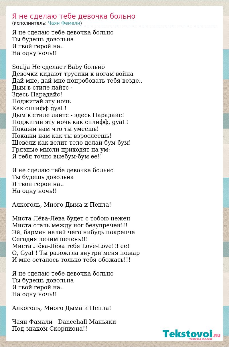 Я не сделаю тебе девочка больно Ты будешь довольна Я твой герой на.. На одну ночь!! Soulja Не сделает Baby больно Девочки кидают трусики к ногам война Дай мне, дай мне попробовать тебя везде.. Дым в стиле лайтс - Здесь Парадайс! Поджигай эту ночь Как сплифф gyal ! Дым в стиле лайтс - здесь Парадайс! Поджигай эту ночь как сплифф, gyal ! Покажи нам что ты умеешь! Покажи нам как ты взрослеешь! Шевели как велит тело делай бум-бум! Грязные мысли приходят на ум: Я тебя точно выебум-бум ее!! Я не сделаю тебе девочка больно Ты будешь довольна Я твой герой на.. На одну ночь!! Алкоголь, Много Дыма и Пепла! Миста Лёва-Лёва будет с тобою нежен Миста сталь между ног безупречен!!! Эй, бармен налей чего нибудь покрепче Сегодня лечим печень!!! Миста Лёва-Лёва тебя Love-Love!!! ее! O, Gyal ! Ты разожгла внутри меня пожар И мне осталось только тебя обожать!!! Я не сделаю тебе девочка больно Ты будешь довольна Я твой герой на.. На одну ночь!! Алкоголь, Много Дыма и Пепла! Чаян Фамали - Dancehall Маньяки Под знаком Скорпиона!!