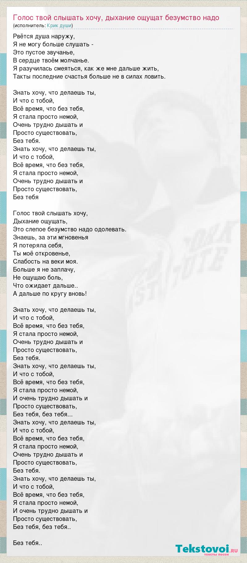 Рвётся душа наружу, Я не могу больше слушать - Это пустое звучанье, В сердце твоём молчанье. Я разучилась смеяться, как же мне дальше жить, Такты последние счастья больше не в силах ловить. Знать хочу, что делаешь ты, И что с тобой, Всё время, что без тебя, Я стала просто немой, Очень трудно дышать и Просто существовать, Без тебя. Знать хочу, что делаешь ты, И что с тобой, Всё время, что без тебя, Я стала просто немой, Очень трудно дышать и Просто существовать, Без тебя Голос твой слышать хочу, Дыхание ощущать, Это слепое безумство надо одолевать. Знаешь, за эти мгновенья Я потеряла себя, Ты моё откровенье, Слабость на веки моя. Больше я не заплачу, Не ощущаю боль, Что ожидает дальше.. А дальше по кругу вновь! Знать хочу, что делаешь ты, И что с тобой, Всё время, что без тебя, Я стала просто немой, Очень трудно дышать и Просто существовать, Без тебя. Знать хочу, что делаешь ты, И что с тобой, Всё время, что без тебя, Я стала просто немой, И очень трудно дышать и Просто существовать, Без тебя, без тебя... Знать хочу, что делаешь ты, И что с тобой, Всё время, что без тебя, Я стала просто немой, Очень трудно дышать и Просто существовать, Без тебя. Знать хочу, что делаешь ты, И что с тобой, Всё время, что без тебя, Я стала просто немой, И очень трудно дышать и Просто существовать, Без тебя, без тебя.. Без тебя..