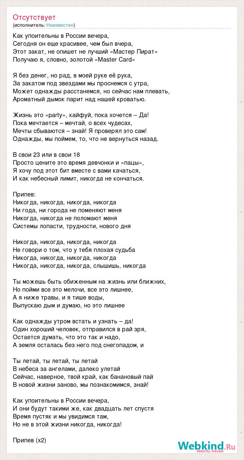 Как упоительны в России вечера, Сегодня он еще красивее, чем был вчера, Этот закат, не опишет не лучший «Мастер Пират» Получаю я, словно, золотой «Master Card» Я без денег, но рад, в моей руке её рука, За закатом под звездами мы проснемся с утра, Может однажды расстанемся, но сейчас нам плевать, Ароматный дымок парит над нашей кроватью. Жизнь это «party», кайфуй, пока хочется – Да! Пока мечтается – мечтай, о всех чудесах, Мечты сбываются – знай! Я проверял это сам! Однажды, мы поймем, то, что не вернуться назад. В свои 23 или в свои 18 Просто цените это время девчонки и «пацы», Я хочу под этот бит вместе с вами качаться, И как небесный лимит, никогда не кончаться. Припев: Никогда, никогда, никогда, никогда Ни года, ни города не поменяют меня Никогда, никогда не поломают меня Системы лопасти, трудности, нового дня Никогда, никогда, никогда, никогда Не говори о том, что у тебя плохая судьба Никогда, никогда, никогда, никогда Никогда, никогда, никогда, слышишь, никогда Ты можешь быть обиженным на жизнь или ближних, Но пойми все это мелочи, все это лишнее, А я ниже травы, и я тише воды, Выпускаю дым и думаю, но это лишнее Как однажды утром встать и узнать – да! Один хороший человек, отправился в рай зря, Остается думать, что это так и надо, А земля осталась без него под снегопадом, и Ты летай, ты летай, ты летай В небеса за ангелами, далеко улетай Сейчас, наверное, твой край, как банановый пай В новой жизни заново, мы познакомимся, знай! Как упоительны в России вечера, И они будут такими же, как двадцать лет спустя Время пустяк и мы увидимся там, Но не в этой жизни никогда, никогда! Припев (х2)