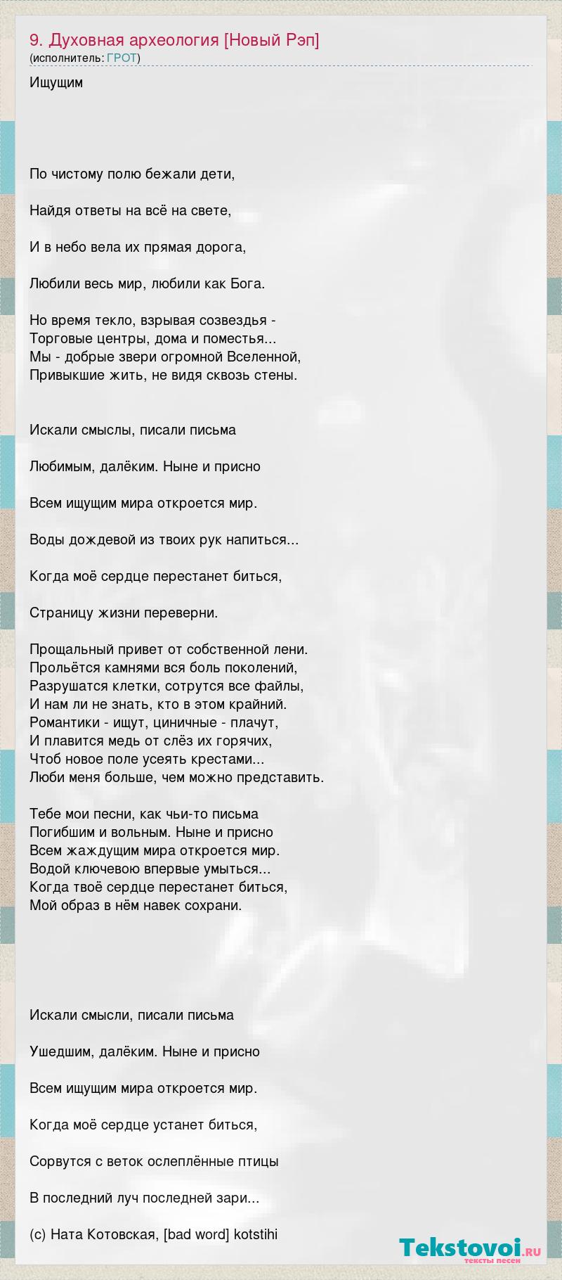 Ищущим По чистому полю бежали дети, Найдя ответы на всё на свете, И в небо вела их прямая дорога, Любили весь мир, любили как Бога. Но время текло, взрывая созвездья - Торговые центры, дома и поместья... Мы - добрые звери огромной Вселенной, Привыкшие жить, не видя сквозь стены. Искали смыслы, писали письма Любимым, далёким. Ныне и присно Всем ищущим мира откроется мир. Воды дождевой из твоих рук напиться... Когда моё сердце перестанет биться, Страницу жизни переверни. Прощальный привет от собственной лени. Прольётся камнями вся боль поколений, Разрушатся клетки, сотрутся все файлы, И нам ли не знать, кто в этом крайний. Романтики - ищут, циничные - плачут, И плавится медь от слёз их горячих, Чтоб новое поле усеять крестами... Люби меня больше, чем можно представить. Тебе мои песни, как чьи-то письма Погибшим и вольным. Ныне и присно Всем жаждущим мира откроется мир. Водой ключевою впервые умыться... Когда твоё сердце перестанет биться, Мой образ в нём навек сохрани. Искали смысли, писали письма Ушедшим, далёким. Ныне и присно Всем ищущим мира откроется мир. Когда моё сердце устанет биться, Сорвутся с веток ослеплённые птицы В последний луч последней зари... (с) Ната Котовская, [bad word] kotstihi