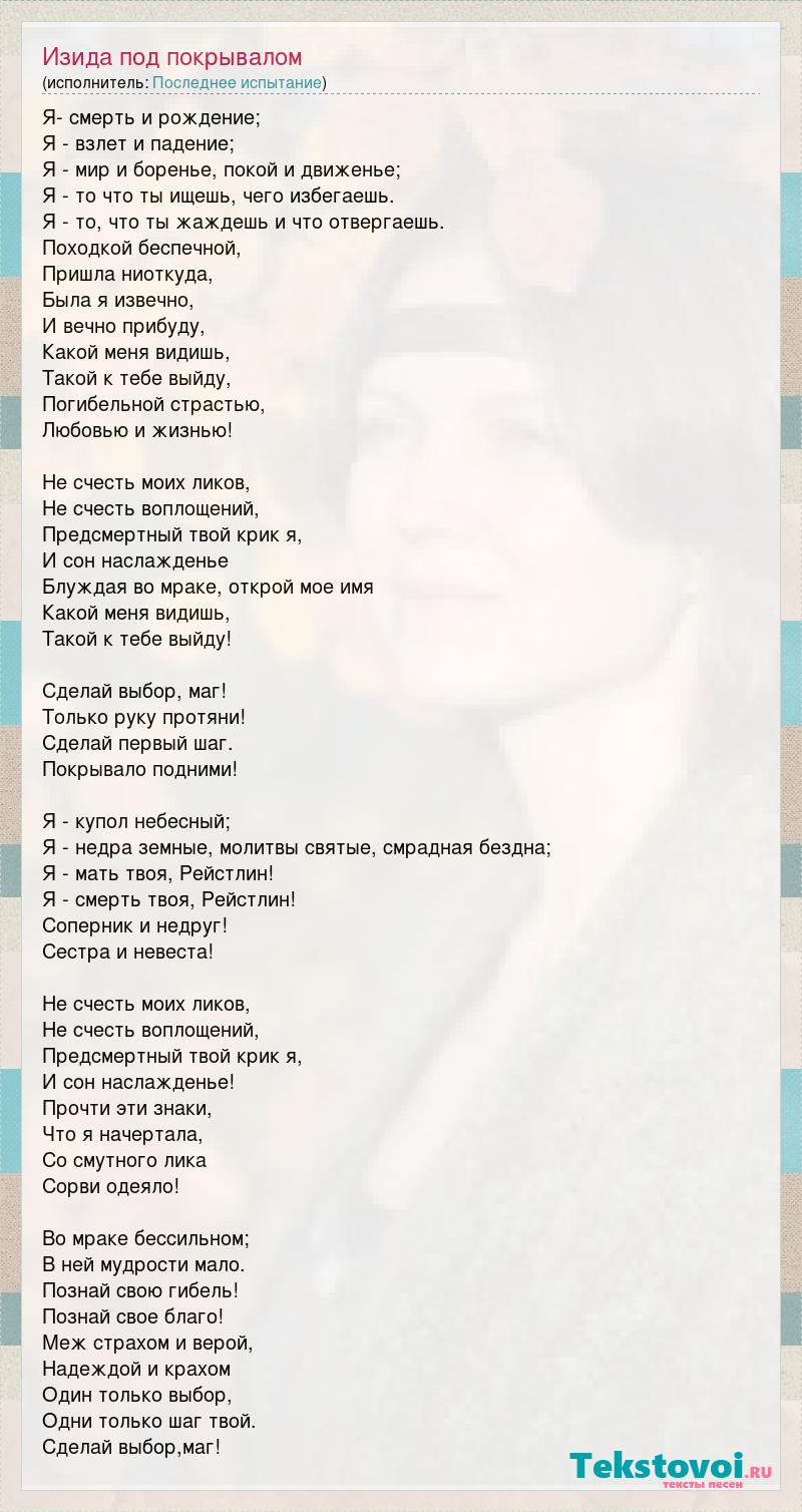 Я- смерть и рождение; Я - взлет и падение; Я - мир и боренье, покой и движенье; Я - то что ты ищешь, чего избегаешь. Я - то, что ты жаждешь и что отвергаешь. Походкой беспечной, Пришла ниоткуда, Была я извечно, И вечно прибуду, Какой меня видишь, Такой к тебе выйду, Погибельной страстью, Любовью и жизнью! Не счесть моих ликов, Не счесть воплощений, Предсмертный твой крик я, И сон наслажденье Блуждая во мраке, открой мое имя Какой меня видишь, Такой к тебе выйду! Сделай выбор, маг! Только руку протяни! Сделай первый шаг. Покрывало подними! Я - купол небесный; Я - недра земные, молитвы святые, смрадная бездна; Я - мать твоя, Рейстлин! Я - смерть твоя, Рейстлин! Соперник и недруг! Сестра и невеста! Не счесть моих ликов, Не счесть воплощений, Предсмертный твой крик я, И сон наслажденье! Прочти эти знаки, Что я начертала, Со смутного лика Сорви одеяло! Во мраке бессильном; В ней мудрости мало. Познай свою гибель! Познай свое благо! Меж страхом и верой, Надеждой и крахом Один только выбор, Одни только шаг твой. Сделай выбор,маг!