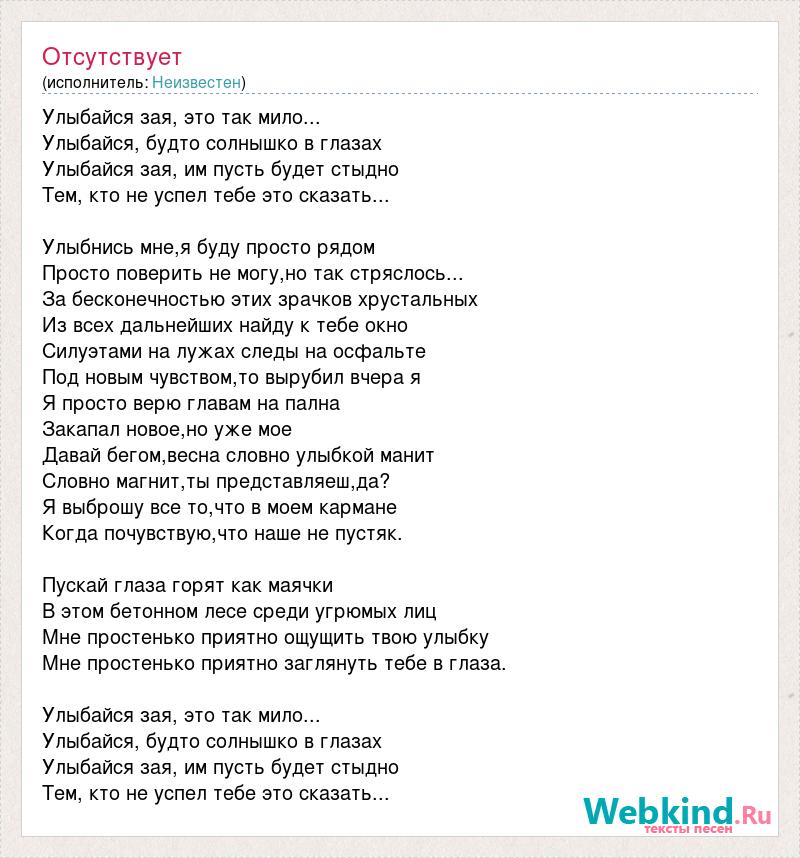 Улыбайся зая, это так мило... Улыбайся, будто солнышко в глазах Улыбайся зая, им пусть будет стыдно Тем, кто не успел тебе это сказать... Улыбнись мне,я буду просто рядом Просто поверить не могу,но так стряслось... За бесконечностью этих зрачков хрустальных Из всех дальнейших найду к тебе окно Силуэтами на лужах следы на осфальте Под новым чувством,то вырубил вчера я Я просто верю главам на пална Закапал новое,но уже мое Давай бегом,весна словно улыбкой манит Словно магнит,ты представляеш,да? Я выброшу все то,что в моем кармане Когда почувствую,что наше не пустяк. Пускай глаза горят как маячки В этом бетонном лесе среди угрюмых лиц Мне простенько приятно ощущить твою улыбку Мне простенько приятно заглянуть тебе в глаза. Улыбайся зая, это так мило... Улыбайся, будто солнышко в глазах Улыбайся зая, им пусть будет стыдно Тем, кто не успел тебе это сказать...