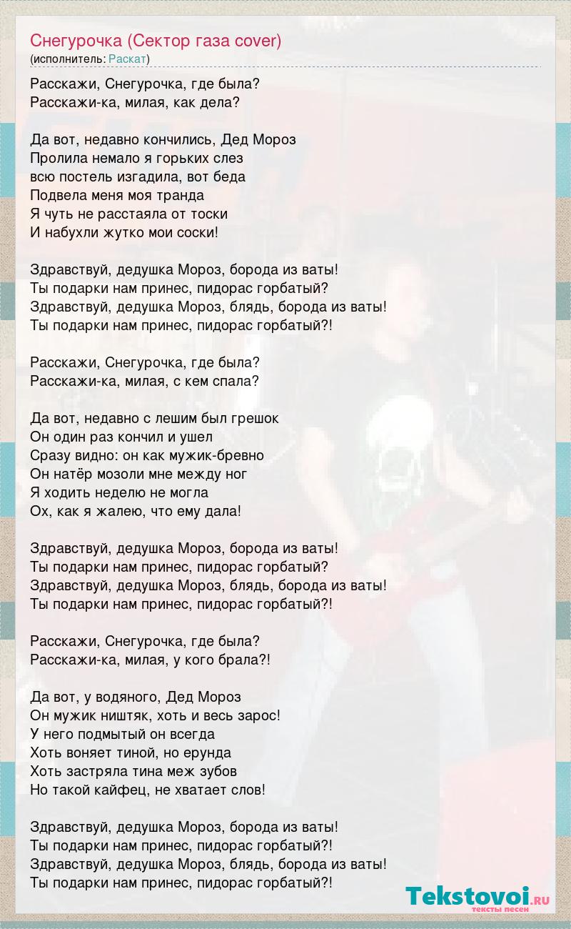 Расскажи, Снегурочка, где была? Расскажи-ка, милая, как дела? Да вот, недавно кончились, Дед Мороз Пролила немало я горьких слез всю постель изгадила, вот беда Подвела меня моя транда Я чуть не расстаяла от тоски И набухли жутко мои соски! Здравствуй, дедушка Мороз, борода из ваты! Ты подарки нам принес, пидораc горбатый? Здравствуй, дедушка Мороз, блядь, борода из ваты! Ты подарки нам принес, пидораc горбатый?! Расскажи, Снегурочка, где была? Расскажи-ка, милая, с кем спала? Да вот, недавно с лешим был грешок Он один раз кончил и ушел Сразу видно: он как мужик-бревно Он натёр мозоли мне между ног Я ходить неделю не могла Ох, как я жалею, что ему дала! Здравствуй, дедушка Мороз, борода из ваты! Ты подарки нам принес, пидораc горбатый? Здравствуй, дедушка Мороз, блядь, борода из ваты! Ты подарки нам принес, пидораc горбатый?! Расскажи, Снегурочка, где была? Расскажи-ка, милая, у кого брала?! Да вот, у водяного, Дед Мороз Он мужик ништяк, хоть и весь зарос! У него подмытый он всегда Хоть воняет тиной, но ерунда Хоть застряла тина меж зубов Но такой кайфец, не хватает слов! Здравствуй, дедушка Мороз, борода из ваты! Ты подарки нам принес, пидораc горбатый?! Здравствуй, дедушка Мороз, блядь, борода из ваты! Ты подарки нам принес, пидораc горбатый?!