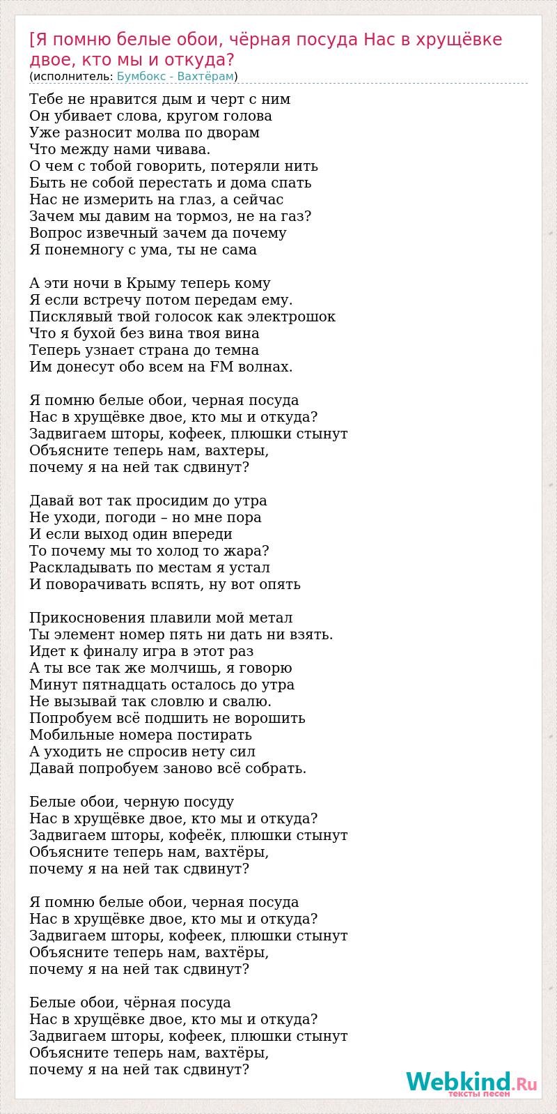 Тебе не нравится дым и черт с ним Он убивает слова, кругом голова Уже разносит молва по дворам Что между нами чивава. О чем с тобой говорить, потеряли нить Быть не собой перестать и дома спать Нас не измерить на глаз, а сейчас Зачем мы давим на тормоз, не на газ? Вопрос извечный зачем да почему Я понемногу с ума, ты не сама А эти ночи в Крыму теперь кому Я если встречу потом передам ему. Писклявый твой голосок как электрошок Что я бухой без вина твоя вина Теперь узнает страна до темна Им донесут обо всем на FM волнах. Я помню белые обои, черная посуда Нас в хрущёвке двое, кто мы и откуда? Задвигаем шторы, кофеек, плюшки стынут Объясните теперь нам, вахтеры, почему я на ней так сдвинут? Давай вот так просидим до утра Не уходи, погоди – но мне пора И если выход один впереди То почему мы то холод то жара? Раскладывать по местам я устал И поворачивать вспять, ну вот опять Прикосновения плавили мой метал Ты элемент номер пять ни дать ни взять. Идет к финалу игра в этот раз А ты все так же молчишь, я говорю Минут пятнадцать осталось до утра Не вызывай так словлю и свалю. Попробуем всё подшить не ворошить Мобильные номера постирать А уходить не спросив нету сил Давай попробуем заново всё собрать. Белые обои, черную посуду Нас в хрущёвке двое, кто мы и откуда? Задвигаем шторы, кофеёк, плюшки стынут Объясните теперь нам, вахтёры, почему я на ней так сдвинут? Я помню белые обои, черная посуда Нас в хрущёвке двое, кто мы и откуда? Задвигаем шторы, кофеек, плюшки стынут Объясните теперь нам, вахтёры, почему я на ней так сдвинут? Белые обои, чёрная посуда Нас в хрущёвке двое, кто мы и откуда? Задвигаем шторы, кофеек, плюшки стынут Объясните теперь нам, вахтёры, почему я на ней так сдвинут?