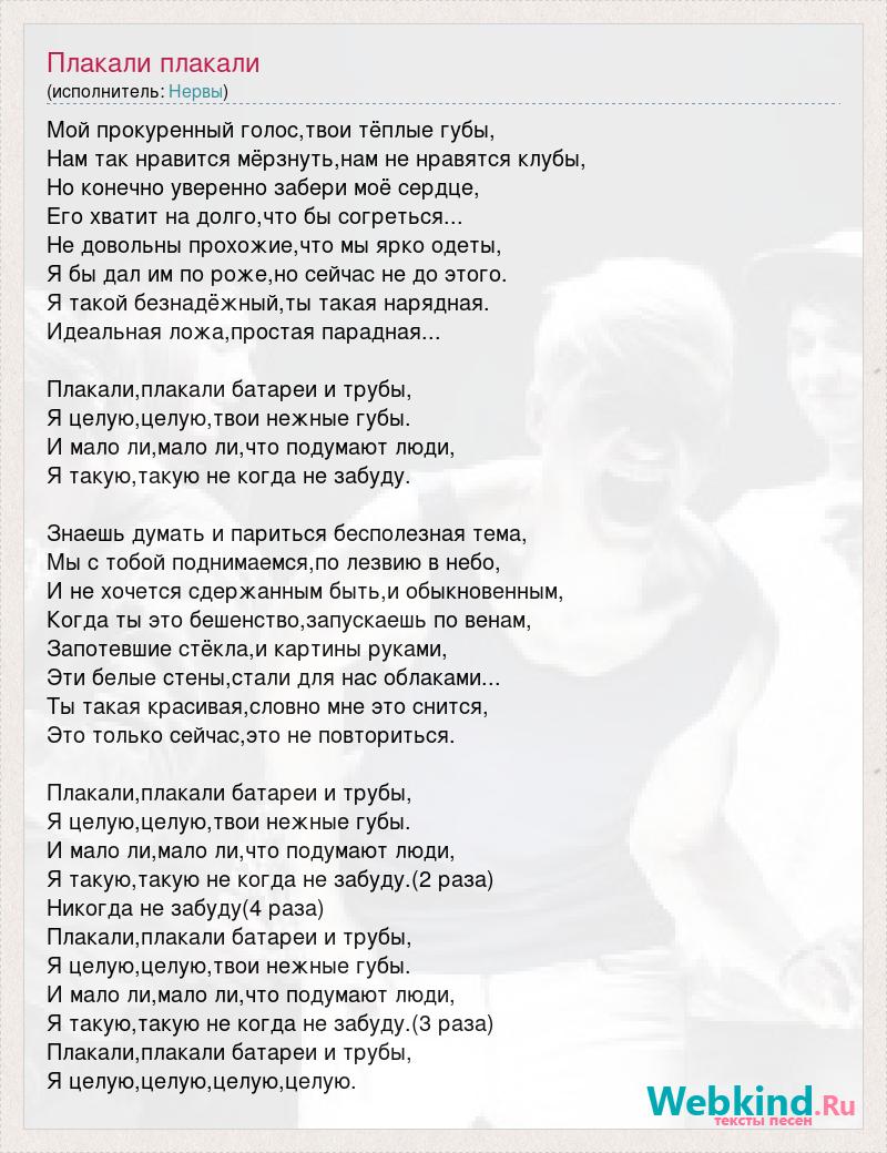 Мой прокуренный голос,твои тёплые губы, Нам так нравится мёрзнуть,нам не нравятся клубы, Но конечно уверенно забери моё сердце, Его хватит на долго,что бы согреться... Не довольны прохожие,что мы ярко одеты, Я бы дал им по роже,но сейчас не до этого. Я такой безнадёжный,ты такая нарядная. Идеальная ложа,простая парадная... Плакали,плакали батареи и трубы, Я целую,целую,твои нежные губы. И мало ли,мало ли,что подумают люди, Я такую,такую не когда не забуду. Знаешь думать и париться бесполезная тема, Мы с тобой поднимаемся,по лезвию в небо, И не хочется сдержанным быть,и обыкновенным, Когда ты это бешенство,запускаешь по венам, Запотевшие стёкла,и картины руками, Эти белые стены,стали для нас облаками... Ты такая красивая,словно мне это снится, Это только сейчас,это не повториться. Плакали,плакали батареи и трубы, Я целую,целую,твои нежные губы. И мало ли,мало ли,что подумают люди, Я такую,такую не когда не забуду.(2 раза) Никогда не забуду(4 раза) Плакали,плакали батареи и трубы, Я целую,целую,твои нежные губы. И мало ли,мало ли,что подумают люди, Я такую,такую не когда не забуду.(3 раза) Плакали,плакали батареи и трубы, Я целую,целую,целую,целую.