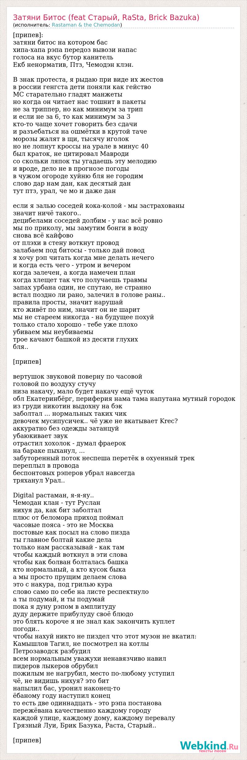 [припев]: затяни битос на котором бас хипа-хапа рэпа передоз вывози напас голоса на вкус бутор канитель Екб ненорматив, Птз, Чемодэн клэн. В знак протеста, я рыдаю при виде их жестов в россии генгста дети поняли как гейство МС старательно гладят манжеты но когда он читает нас тошнит в пакеты не за триппер, но как минимум за трип и если не за 6, то как минимум за 3 кто-то чаще хочет говорить без сдачи и разъебаться на ошмётки в крутой таче морозы жалят в щи, тысячу иголок но не лопнут кроссы на урале в минус 40 был краток, не цитировал Мавроди со скольки ляпок ты угадаешь эту мелодию и вроде, дело не в прогнозе погоды в чужом огороде хуйню бля не городим слово дар нам дан, как десятый дан тут птз, урал, че мо и даже дан если я залью соседей кока-колой - мы застрахованы значит ничё такого.. децибелами соседей долбим - у нас всё ровно мы по приколу, мы замутим бонги в воду снова всё кайфово от плэхи в стену воткнут провод залабаем под битосы - только дай повод я хочу рэп читать когда мне делать нечего и когда есть чего - утром и вечером когда залечен, а когда намечен план когда хлещет так что получаешь травмы запах урбана один, не спутаю, не странно встал поздно ли рано, залечил в голове раны.. правила просты, значит нарушай кто живёт по ним, значит он не шарит мы не стареем никогда - на будущее похуй только стало хорошо - тебе уже плохо убиваем мы неубиваемы трое качают башкой из десяти глухих бля.. [припев] вертушок звуковой поверну по часовой головой по воздуху стучу низа накачу, мало будет накачу ещё чуток обл Екатеринбёрг, периферия нама тама напутана мутный городок из груди никотин выдохну на бэк заболтал ... нормальных таких чик девочек мусипусичек.. чё уже не вкатывает Krec? аккуратно без одежды затанцуй убаюкивает звук отрастил хохолок - думал фраерок на бараке пыханул, ... забуторенный поток неспеша перетёк в охуенный трек переплыл в провода беспонтовых рэперов убрал навсегда тряханул Урал.. Digital растаман, я-я-яу.. Чемодан клан - тут Руслан нихуя да, как бит заболтал плюс от беломора приход поймал часовые пояса - это не Москва постовые как посыл на слово пизда ты главное болтай какие дела только нам рассказывай - как там чтобы каждый воткнул в эти слова чтобы как болван болталась башка кто нормальный, а кто кусок быка а мы просто прущим делаем слова это с накура, под грилью кура слово само по себе на листе респектнуло а ты подумай, и ты подумай пока я дуну рэпом в амплитуду дуду держите прибулуду своё блюдо это блять короче я не знал как закончить куплет погоди.. чтобы нахуй никто не пиздел что этот музон не вкатил: Камышлов Тагил, не посмотрел на котлы Петрозаводск разбудил всем нормальным уважухи ненавязчиво навил пидеров лыкеров обрубил пожилым не нагрубил, место по-любому уступил чё, не видишь нихуя? это бит напылил бас, уронил наконец-то ёбаному году наступил конец то есть две одиннадцать - это рэпа постанова пережёвана качественно каждому городу каждой улице, каждому дому, каждому перевалу Грязный Луи, Брик Базука, Раста, Старый.. [припев]