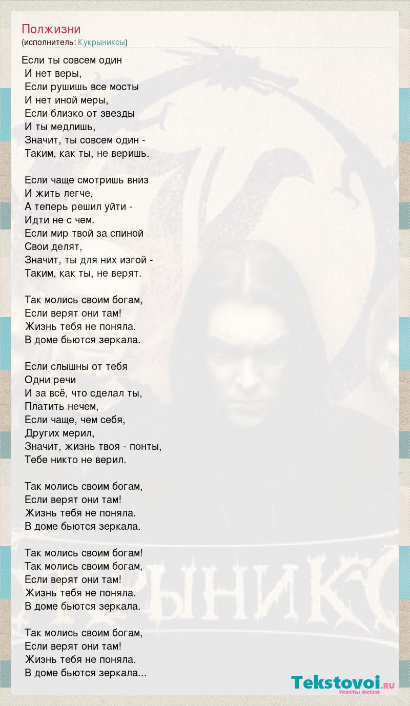Если ты совсем один И нет веры, Если рушишь все мосты И нет иной меры, Если близко от звезды И ты медлишь, Значит, ты совсем один - Таким, как ты, не веришь. Если чаще смотришь вниз И жить легче, А теперь решил уйти - Идти не с чем. Если мир твой за спиной Свои делят, Значит, ты для них изгой - Таким, как ты, не верят. Так молись своим богам, Если верят они там! Жизнь тебя не поняла. В доме бьются зеркала. Если слышны от тебя Одни речи И за всё, что сделал ты, Платить нечем, Если чаще, чем себя, Других мерил, Значит, жизнь твоя - понты, Тебе никто не верил. Так молись своим богам, Если верят они там! Жизнь тебя не поняла. В доме бьются зеркала. Так молись своим богам! Так молись своим богам, Если верят они там! Жизнь тебя не поняла. В доме бьются зеркала. Так молись своим богам, Если верят они там! Жизнь тебя не поняла. В доме бьются зеркала...