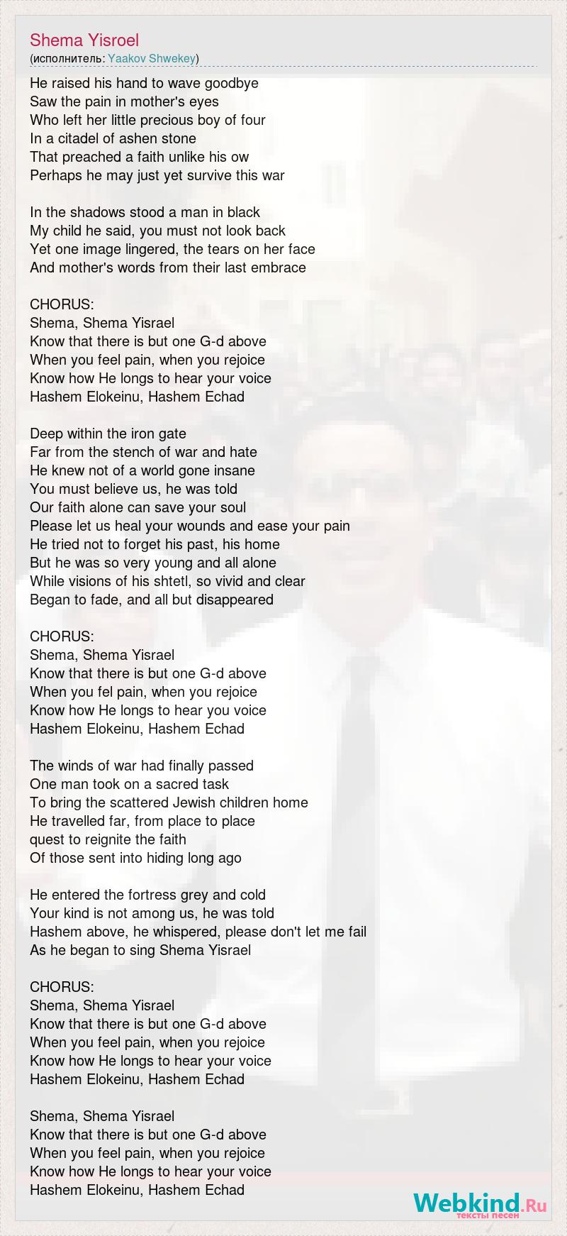 He raised his hand to wave goodbye Saw the pain in mother's eyes Who left her little precious boy of four In a citadel of ashen stone That preached a faith unlike his ow Perhaps he may just yet survive this war In the shadows stood a man in black My child he said, you must not look back Yet one image lingered, the tears on her face And mother's words from their last embrace CHORUS: Shema, Shema Yisrael Know that there is but one G-d above When you feel pain, when you rejoice Know how He longs to hear your voice Hashem Elokeinu, Hashem Echad Deep within the iron gate Far from the stench of war and hate He knew not of a world gone insane You must believe us, he was told Our faith alone can save your soul Please let us heal your wounds and ease your pain He tried not to forget his past, his home But he was so very young and all alone While visions of his shtetl, so vivid and clear Began to fade, and all but disappeared CHORUS: Shema, Shema Yisrael Know that there is but one G-d above When you fel pain, when you rejoice Know how He longs to hear you voice Hashem Elokeinu, Hashem Echad The winds of war had finally passed One man took on a sacred task To bring the scattered Jewish children home He travelled far, from place to place quest to reignite the faith Of those sent into hiding long ago He entered the fortress grey and cold Your kind is not among us, he was told Hashem above, he whispered, please don't let me fail As he began to sing Shema Yisrael CHORUS: Shema, Shema Yisrael Know that there is but one G-d above When you feel pain, when you rejoice Know how He longs to hear your voice Hashem Elokeinu, Hashem Echad Shema, Shema Yisrael Know that there is but one G-d above When you feel pain, when you rejoice Know how He longs to hear your voice Hashem Elokeinu, Hashem Echad