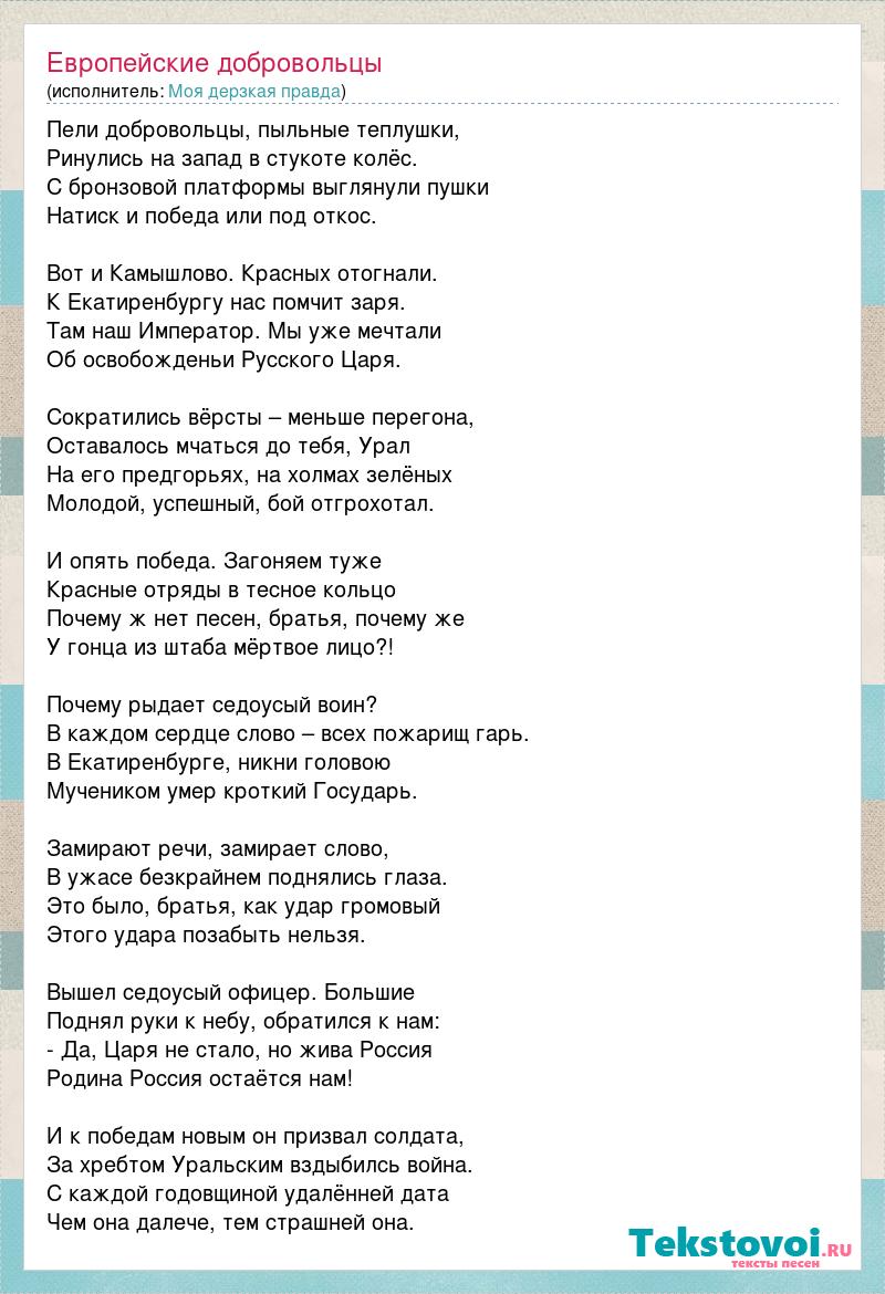 Пели добровольцы, пыльные теплушки, Ринулись на запад в стукоте колёс. С бронзовой платформы выглянули пушки Натиск и победа или под откос. Вот и Камышлово. Красных отогнали. К Екатиренбургу нас помчит заря. Там наш Император. Мы уже мечтали Об освобожденьи Русского Царя. Сократились вёрсты – меньше перегона, Оставалось мчаться до тебя, Урал На его предгорьях, на холмах зелёных Молодой, успешный, бой отгрохотал. И опять победа. Загоняем туже Красные отряды в тесное кольцо Почему ж нет песен, братья, почему же У гонца из штаба мёртвое лицо?! Почему рыдает седоусый воин? В каждом сердце слово – всех пожарищ гарь. В Екатиренбурге, никни головою Мучеником умер кроткий Государь. Замирают речи, замирает слово, В ужасе безкрайнем поднялись глаза. Это было, братья, как удар громовый Этого удара позабыть нельзя. Вышел седоусый офицер. Большие Поднял руки к небу, обратился к нам: - Да, Царя не стало, но жива Россия Родина Россия остаётся нам! И к победам новым он призвал солдата, За хребтом Уральским вздыбилсь война. С каждой годовщиной удалённей дата Чем она далече, тем страшней она.