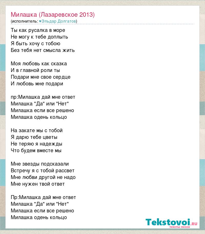 Ты как русалка в море Не могу к тебе доплыть Я быть хочу с тобою Без тебя нет смысла жить Моя любовь как сказка И в главной роли ты Подари мне свое сердце И любовь мне подари пр:Милашка дай мне ответ Милашка "Да" или "Нет" Милашка если все решено Милашка одень кольцо На закате мы с тобой Я дарю тебе цветы Не теряю я надежды Что будем вместе мы Мне звезды подсказали Встречу я с тобой рассвет Мне любви другой не надо Мне нужен твой ответ Пр:Милашка дай мне ответ Милашка "Да" или "Нет" Милашка если все решено Милашка одень кольцо