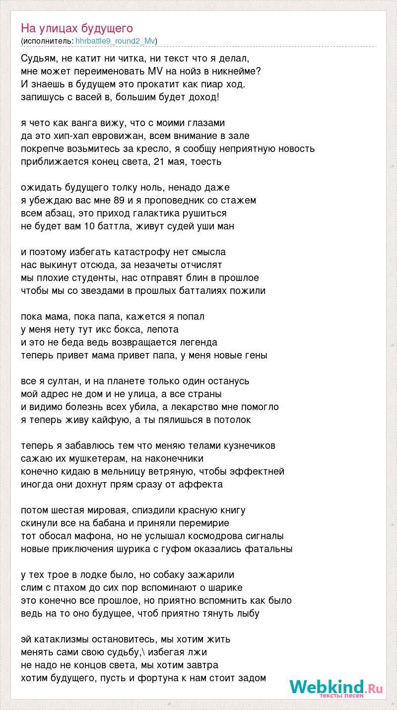 Судьям, не катит ни читка, ни текст что я делал, мне может переименовать MV на нойз в никнейме? И знаешь в будущем это прокатит как пиар ход. запишусь с васей в, большим будет доход! я чето как ванга вижу, что с моими глазами да это хип-хап евровижан, всем внимание в зале покрепче возьмитесь за кресло, я сообщу неприятную новость приближается конец света, 21 мая, тоесть ожидать будущего толку ноль, ненадо даже я убеждаю вас мне 89 и я проповедник со стажем всем абзац, это приход галактика рушиться не будет вам 10 баттла, живут судей уши ман и поэтому избегать катастрофу нет смысла нас выкинут отсюда, за незачеты отчислят мы плохие студенты, нас отправят блин в прошлое чтобы мы со звездами в прошлых батталиях пожили пока мама, пока папа, кажется я попал у меня нету тут икс бокса, лепота и это не беда ведь возвращается легенда теперь привет мама привет папа, у меня новые гены все я султан, и на планете только один останусь мой адрес не дом и не улица, а все страны и видимо болезнь всех убила, а лекарство мне помогло я теперь живу кайфую, а ты пялишься в потолок теперь я забавлюсь тем что меняю телами кузнечиков сажаю их мушкетерам, на наконечники конечно кидаю в мельницу ветряную, чтобы эффектней иногда они дохнут прям сразу от аффекта потом шестая мировая, спиздили красную книгу скинули все на бабана и приняли перемирие тот обосал мафона, но не услышал космодрова сигналы новые приключения шурика с гуфом оказались фатальны у тех трое в лодке было, но собаку зажарили слим с птахом до сих пор вспоминают о шарике это конечно все прошлое, но приятно вспомнить как было ведь на то оно будущее, чтоб приятно тянуть лыбу эй катаклизмы остановитесь, мы хотим жить менять сами свою судьбу,\ избегая лжи не надо не концов света, мы хотим завтра хотим будущего, пусть и фортуна к нам стоит задом