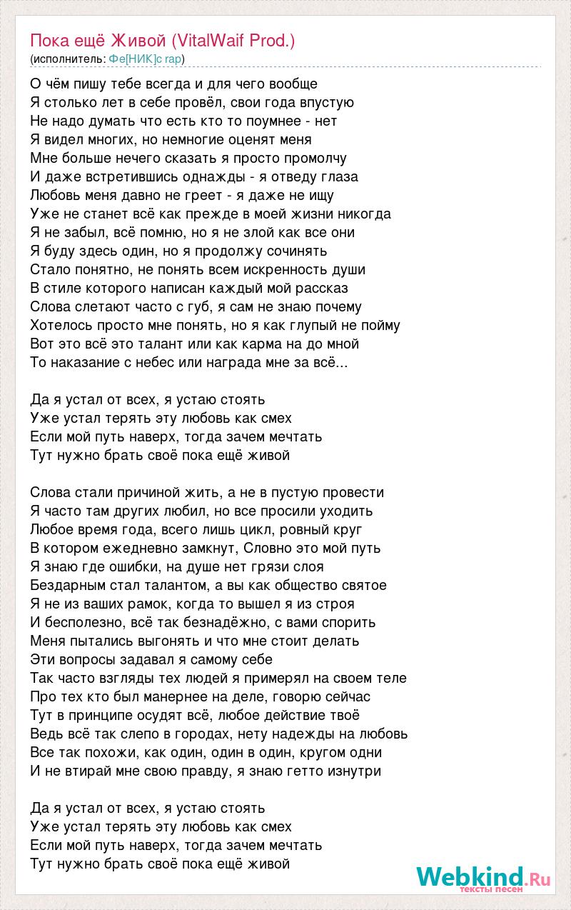 О чём пишу тебе всегда и для чего вообще Я столько лет в себе провёл, свои года впустую Не надо думать что есть кто то поумнее - нет Я видел многих, но немногие оценят меня Мне больше нечего сказать я просто промолчу И даже встретившись однажды - я отведу глаза Любовь меня давно не греет - я даже не ищу Уже не станет всё как прежде в моей жизни никогда Я не забыл, всё помню, но я не злой как все они Я буду здесь один, но я продолжу сочинять Стало понятно, не понять всем искренность души В стиле которого написан каждый мой рассказ Слова слетают часто с губ, я сам не знаю почему Хотелось просто мне понять, но я как глупый не пойму Вот это всё это талант или как карма на до мной То наказание с небес или награда мне за всё... Да я устал от всех, я устаю стоять Уже устал терять эту любовь как смех Если мой путь наверх, тогда зачем мечтать Тут нужно брать своё пока ещё живой Слова стали причиной жить, а не в пустую провести Я часто там других любил, но все просили уходить Любое время года, всего лишь цикл, ровный круг В котором ежедневно замкнут, Словно это мой путь Я знаю где ошибки, на душе нет грязи слоя Бездарным стал талантом, а вы как общество святое Я не из ваших рамок, когда то вышел я из строя И бесполезно, всё так безнадёжно, с вами спорить Меня пытались выгонять и что мне стоит делать Эти вопросы задавал я самому себе Так часто взгляды тех людей я примерял на своем теле Про тех кто был манернее на деле, говорю сейчас Тут в принципе осудят всё, любое действие твоё Ведь всё так слепо в городах, нету надежды на любовь Все так похожи, как один, один в один, кругом одни И не втирай мне свою правду, я знаю гетто изнутри Да я устал от всех, я устаю стоять Уже устал терять эту любовь как смех Если мой путь наверх, тогда зачем мечтать Тут нужно брать своё пока ещё живой