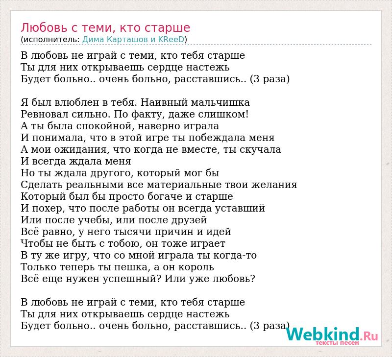 В любовь не играй с теми, кто тебя старше Ты для них открываешь сердце настежь Будет больно.. очень больно, расставшись.. (3 раза) Я был влюблен в тебя. Наивный мальчишка Ревновал сильно. По факту, даже слишком! А ты была спокойной, наверно играла И понимала, что в этой игре ты побеждала меня А мои ожидания, что когда не вместе, ты скучала И всегда ждала меня Но ты ждала другого, который мог бы Сделать реальными все материальные твои желания Который был бы просто богаче и старше И похер, что после работы он всегда уставший Или после учебы, или после друзей Всё равно, у него тысячи причин и идей Чтобы не быть с тобою, он тоже играет В ту же игру, что со мной играла ты когда-то Только теперь ты пешка, а он король Всё еще нужен успешный? Или уже любовь? В любовь не играй с теми, кто тебя старше Ты для них открываешь сердце настежь Будет больно.. очень больно, расставшись.. (3 раза)