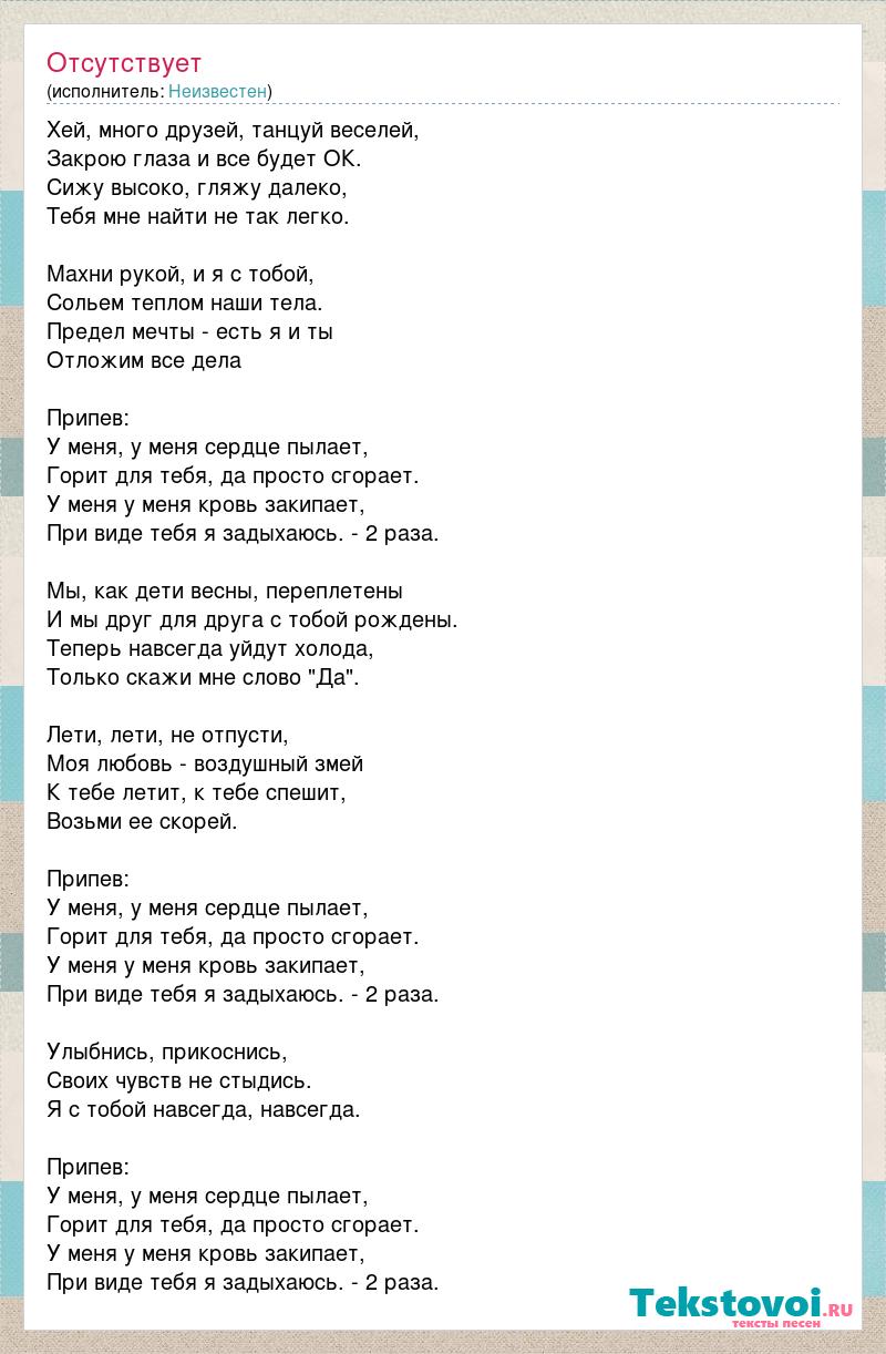 Хей, много друзей, танцуй веселей, Закрою глаза и все будет ОК. Сижу высоко, гляжу далеко, Тебя мне найти не так легко. Махни рукой, и я с тобой, Сольем теплом наши тела. Предел мечты - есть я и ты Отложим все дела Припев: У меня, у меня сердце пылает, Горит для тебя, да просто сгорает. У меня у меня кровь закипает, При виде тебя я задыхаюсь. - 2 раза. Мы, как дети весны, переплетены И мы друг для друга с тобой рождены. Теперь навсегда уйдут холода, Только скажи мне слово "Да". Лети, лети, не отпусти, Моя любовь - воздушный змей К тебе летит, к тебе спешит, Возьми ее скорей. Припев: У меня, у меня сердце пылает, Горит для тебя, да просто сгорает. У меня у меня кровь закипает, При виде тебя я задыхаюсь. - 2 раза. Улыбнись, прикоснись, Своих чувств не стыдись. Я с тобой навсегда, навсегда. Припев: У меня, у меня сердце пылает, Горит для тебя, да просто сгорает. У меня у меня кровь закипает, При виде тебя я задыхаюсь. - 2 раза.