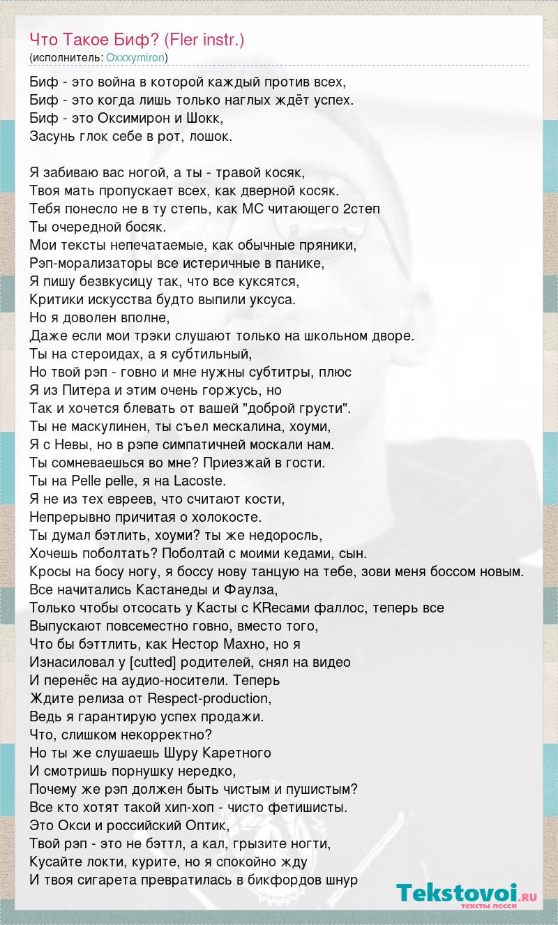 Биф - это война в которой каждый против всех, Биф - это когда лишь только наглых ждёт успех. Биф - это Оксимирон и Шокк, Засунь глок себе в рот, лошок. Я забиваю вас ногой, а ты - травой косяк, Твоя мать пропускает всех, как дверной косяк. Тебя понесло не в ту степь, как MC читающего 2степ Ты очередной босяк. Мои тексты непечатаемые, как обычные пряники, Рэп-морализаторы все истеричные в панике, Я пишу безвкусицу так, что все куксятся, Критики искусства будто выпили уксуса. Но я доволен вполне, Даже если мои трэки слушают только на школьном дворе. Ты на стероидах, а я субтильный, Но твой рэп - говно и мне нужны субтитры, плюс Я из Питера и этим очень горжусь, но Так и хочется блевать от вашей "доброй грусти". Ты не маскулинен, ты съел мескалина, хоуми, Я с Невы, но в рэпе симпатичней москали нам. Ты сомневаешься во мне? Приезжай в гости. Ты на Pelle pelle, я на Lacoste. Я не из тех евреев, что считают кости, Непрерывно причитая о холокосте. Ты думал бэтлить, хоуми? ты же недоросль, Хочешь поболтать? Поболтай с моими кедами, сын. Кросы на босу ногу, я боссу нову танцую на тебе, зови меня боссом новым. Все начитались Кастанеды и Фаулза, Только чтобы отсосать у Касты с KRecами фаллос, теперь все Выпускают повсеместно говно, вместо того, Что бы бэттлить, как Нестор Махно, но я Изнасиловал у [cutted] родителей, снял на видео И перенёс на аудио-носители. Теперь Ждите релиза от Respect-production, Ведь я гарантирую успех продажи. Что, слишком некорректно? Но ты же слушаешь Шуру Каретного И смотришь порнушку нередко, Почему же рэп должен быть чистым и пушистым? Все кто хотят такой хип-хоп - чисто фетишисты. Это Окси и российский Оптик, Твой рэп - это не бэттл, а кал, грызите ногти, Кусайте локти, курите, но я спокойно жду И твоя сигарета превратилась в бикфордов шнур