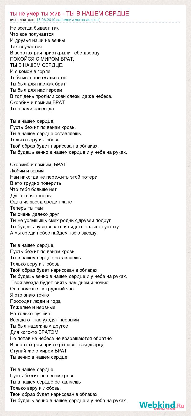 Не всегда бывает так Что все получается И друзья наши не вечны Так случается. В воротах рая приоткрыли тебе дверцу ПОКОЙСЯ С МИРОМ БРАТ, ТЫ В НАШЕМ СЕРДЦЕ. И с комом в горле Тебя мы провожали стоя Ты был для нас как брат Ты был для нас героем В тот день пролили сови слезы даже небеса. Скорбим и помним,БРАТ Ты с нами навесгда Ты в нашем сердце, Пусть бежит по венам кровь. Ты в нашем сердце оставляешь Только веру и любовь. Твой образ будет нарисован в облаках. Ты будешь вечно в нашем сердце и у неба на руках. Скормиб и помним, БРАТ Любим и верим Нам никогда не пережить этой потери В это трудно поверить Что тебя больше нет Душа твоя теперь Одна из звезд среди планет Теперь ты там Ты очень далеко друг Ты не услышишь смех родных,друзей подруг Ты будешь чувствовать и видеть только пустоту А мы среди небес найдем твою звезду. Ты в нашем сердце, Пусть бежит по венам кровь. Ты в нашем сердце оставляешь Только веру и любовь. Твой образ будет нарисован в облаках. Ты будешь вечно в нашем сердце и у неба на руках. Твоя звезда будет сиять нам днем и ночью Она поможет в трудный час Я это знаю точно Проходят люди и года Тяжелые и нервные Но только лучшие Всегда от нас уходят первыми Ты был надежным другои Для кого-то БРАТОМ Но попав на небеса не возращаются обратно В воротах рая приоткрылась твоя дверца Ступай же с миром БРАТ Ты вечно в нашем сердце Ты в нашем сердце, Пусть бежит по венам кровь. Ты в нашем сердце оставляешь Только веру и любовь. Твой образ будет нарисован в облаках. Ты будешь вечно в нашем сердце и у неба на руках.