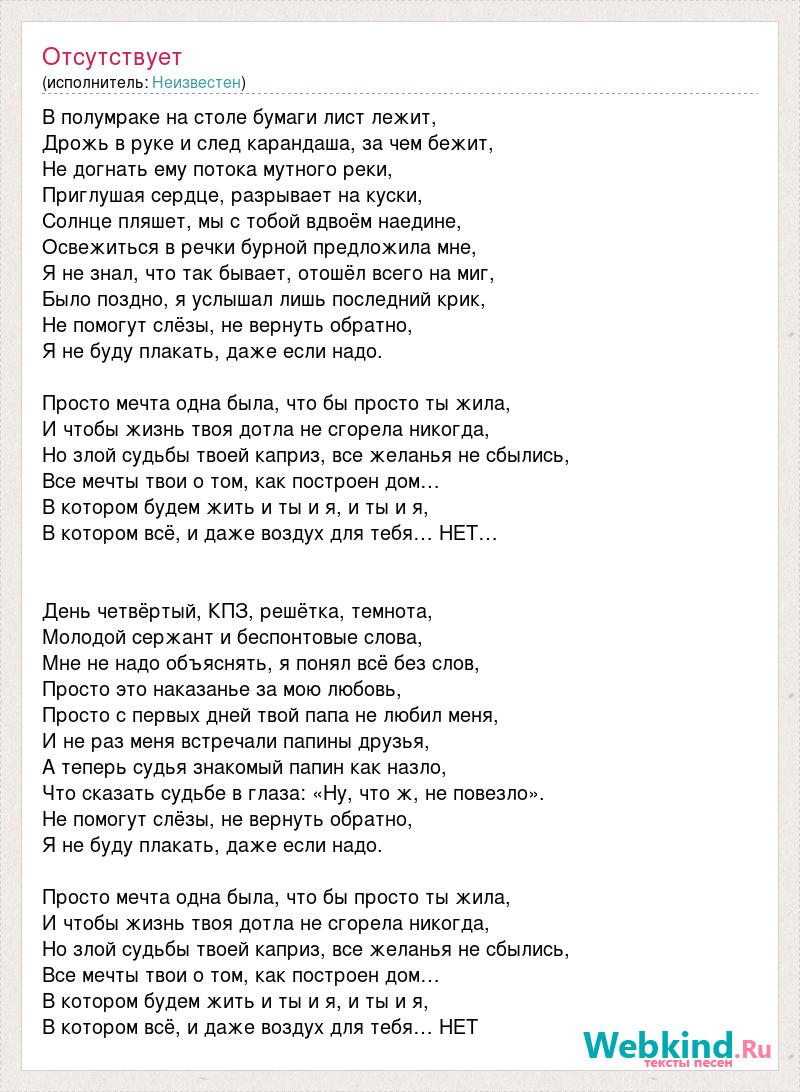В полумраке на столе бумаги лист лежит, Дрожь в руке и след карандаша, за чем бежит, Не догнать ему потока мутного реки, Приглушая сердце, разрывает на куски, Солнце пляшет, мы с тобой вдвоём наедине, Освежиться в речки бурной предложила мне, Я не знал, что так бывает, отошёл всего на миг, Было поздно, я услышал лишь последний крик, Не помогут слёзы, не вернуть обратно, Я не буду плакать, даже если надо. Просто мечта одна была, что бы просто ты жила, И чтобы жизнь твоя дотла не сгорела никогда, Но злой судьбы твоей каприз, все желанья не сбылись, Все мечты твои о том, как построен дом… В котором будем жить и ты и я, и ты и я, В котором всё, и даже воздух для тебя… НЕТ… День четвёртый, КПЗ, решётка, темнота, Молодой сержант и беспонтовые слова, Мне не надо объяснять, я понял всё без слов, Просто это наказанье за мою любовь, Просто с первых дней твой папа не любил меня, И не раз меня встречали папины друзья, А теперь судья знакомый папин как назло, Что сказать судьбе в глаза: «Ну, что ж, не повезло». Не помогут слёзы, не вернуть обратно, Я не буду плакать, даже если надо. Просто мечта одна была, что бы просто ты жила, И чтобы жизнь твоя дотла не сгорела никогда, Но злой судьбы твоей каприз, все желанья не сбылись, Все мечты твои о том, как построен дом… В котором будем жить и ты и я, и ты и я, В котором всё, и даже воздух для тебя… НЕТ