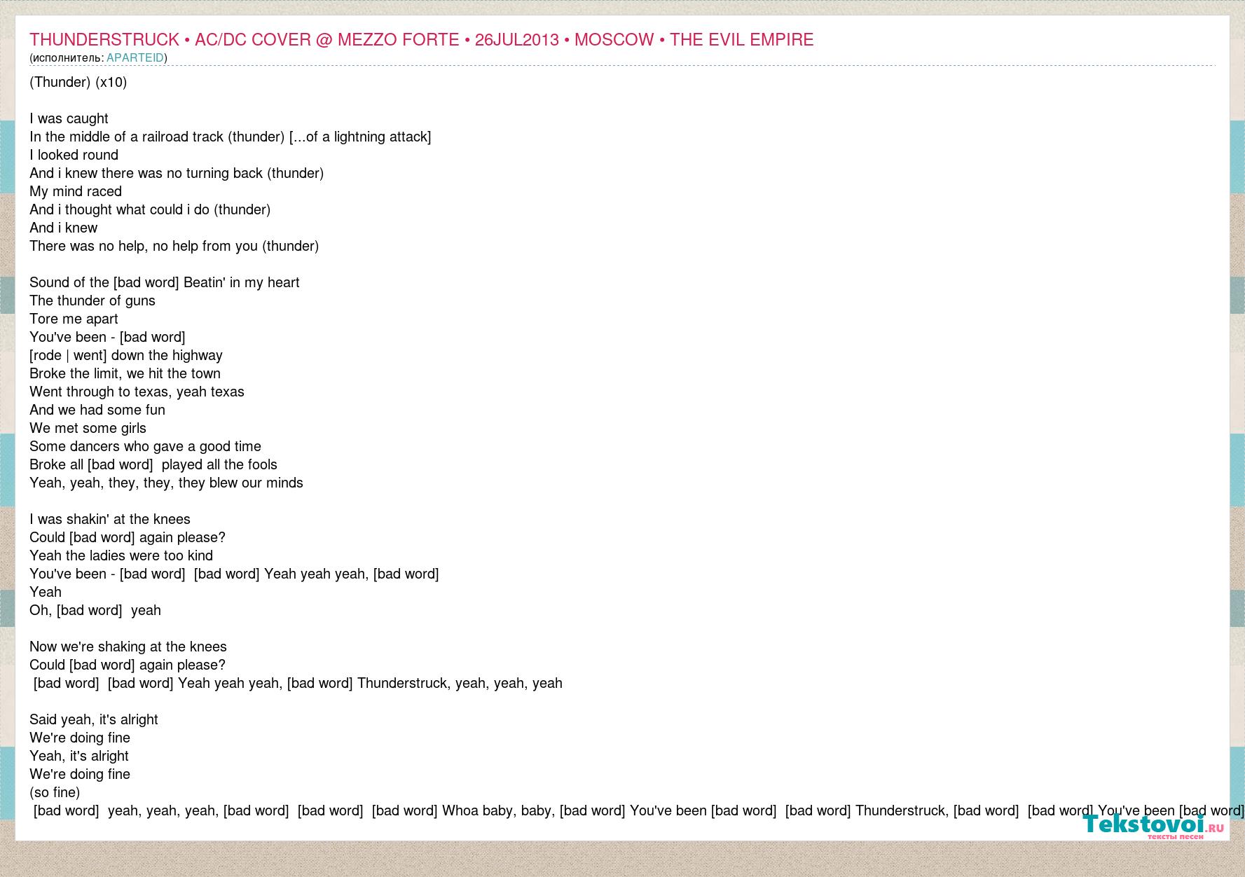 А как ты думаешь, о чем песня "THUNDERSTRUCK • AC/DC COVER @ MEZZO FORTE • 26JUL2013 • MOSCOW • THE EVI" ?
