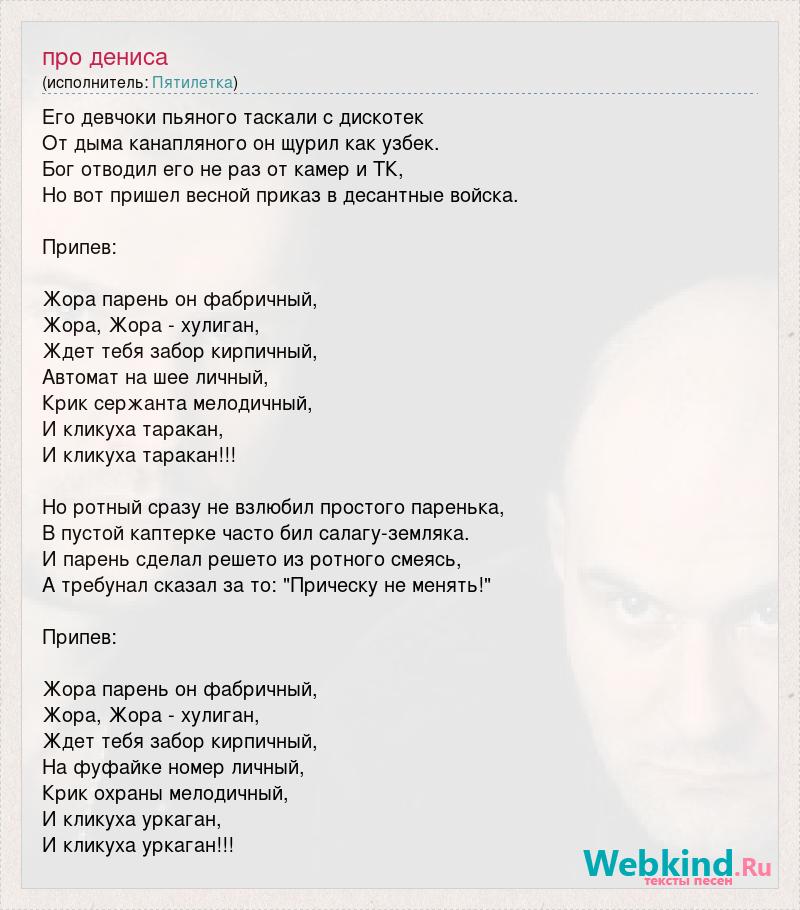 Его девчоки пьяного таскали с дискотек От дыма канапляного он щурил как узбек. Бог отводил его не раз от камер и ТК, Но вот пришел весной приказ в десантные войска. Припев: Жора парень он фабричный, Жора, Жора - хулиган, Ждет тебя забор кирпичный, Автомат на шее личный, Крик сержанта мелодичный, И кликуха таракан, И кликуха таракан!!! Но ротный сразу не взлюбил простого паренька, В пустой каптерке часто бил салагу-земляка. И парень сделал решето из ротного смеясь, А требунал сказал за то: "Прическу не менять!" Припев: Жора парень он фабричный, Жора, Жора - хулиган, Ждет тебя забор кирпичный, На фуфайке номер личный, Крик охраны мелодичный, И кликуха уркаган, И кликуха уркаган!!!